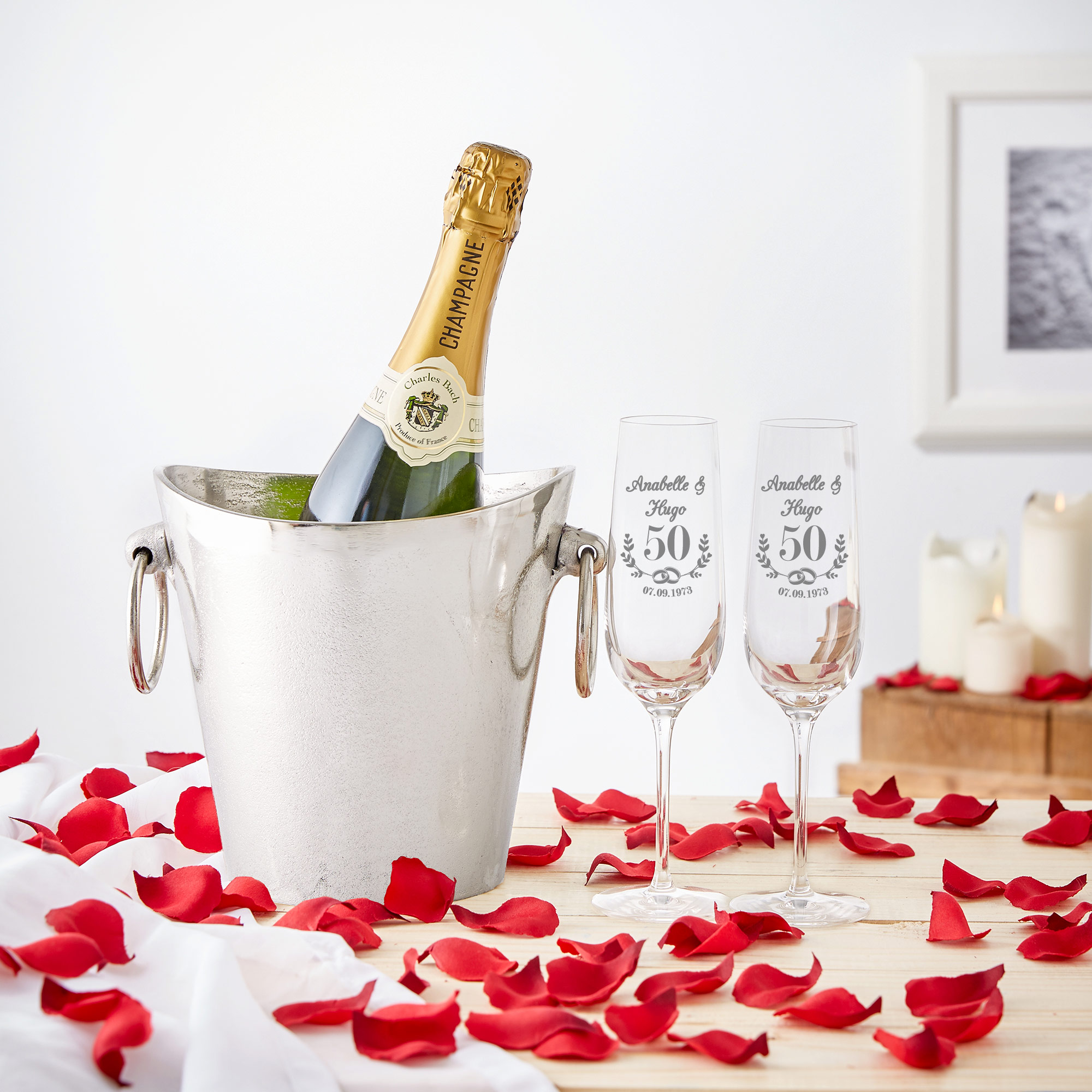 Die beiden Sektgläser zur Goldhochzeit sind ein sentimentaler Ausdruck von Liebe und Beständigkeit. Durch die kunstvolle Gravur eines Ringmotivs, der Namen des Paares und einem Wunschdatum, werden die Gläser zu individuellen Meisterwerken, die fünf Jahrzehnte voller gemeinsamer Erlebnisse und glücklicher Momente widerspiegeln.