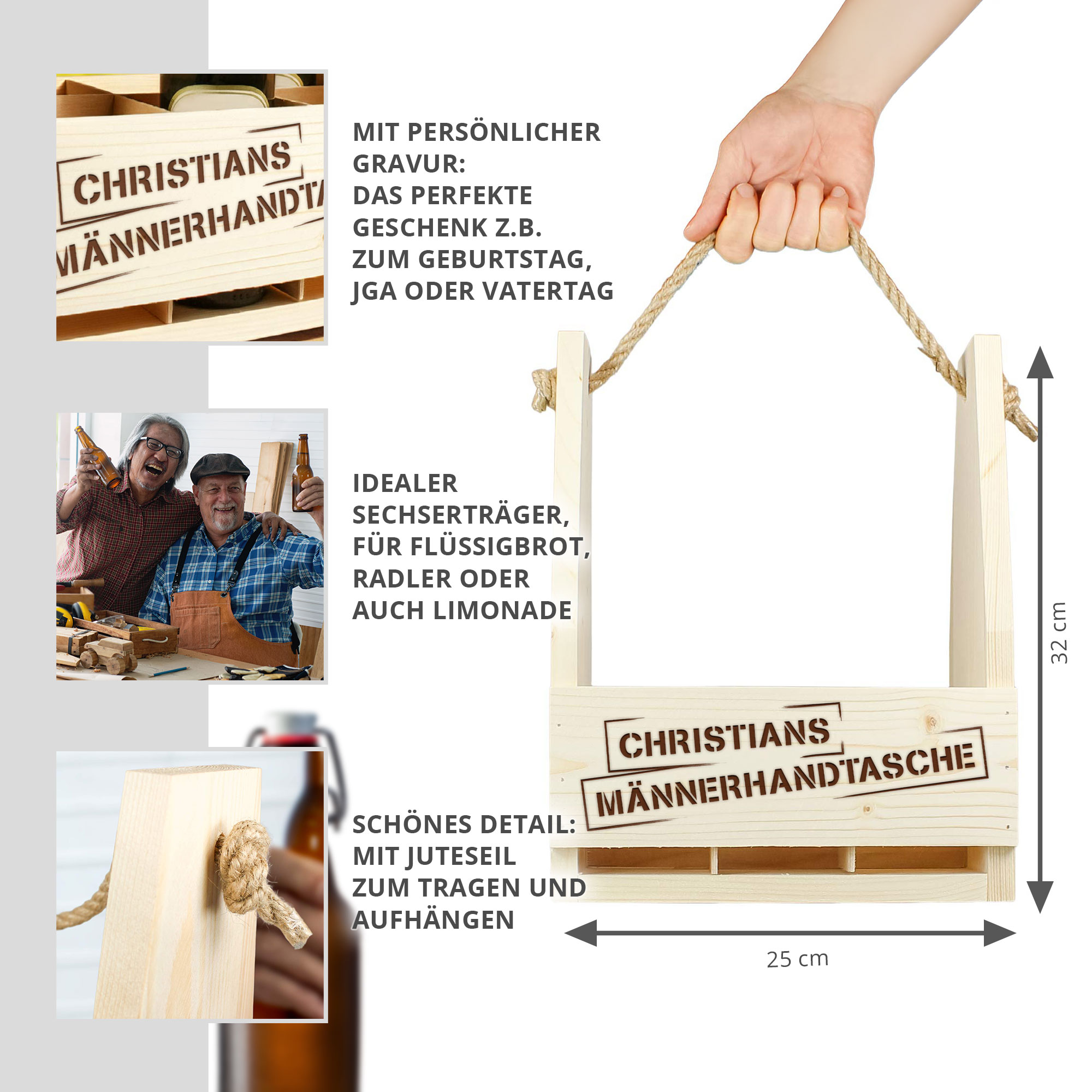Der Bierflaschenträger im beliebten Männerhandtaschen-Design ist die perfekte Kombination aus Funktionalität und persönlicher Note. Gefertigt aus robustem Holz überzeugt der Träger durch seine stabile Bauweise und sein durchdachtes Innenleben, das ausreichend Platz für mehrere Flaschen bietet. Durch die individuelle Gravur mit Ihrem Wunschnamen wird dieses praktische Accessoire zu einem einzigartigen Begleiter für gesellige Anlässe.