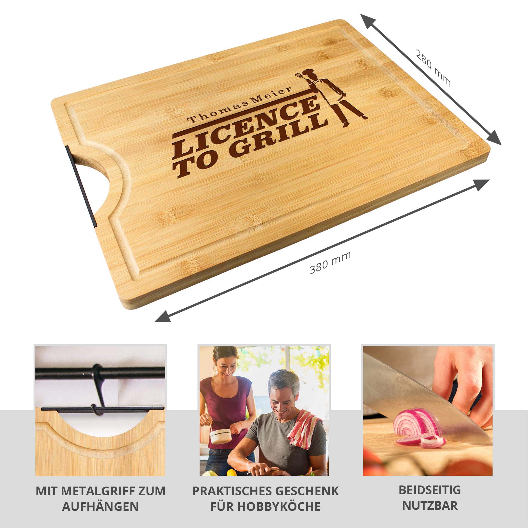 Präsentiere Deinem Grillmeister eine wahre Lizenz zum Grillen mit unserem exquisiten Bambusholz-Schneidebrett, veredelt mit der einzigartigen Gravur 'Licence to Grill' und dem persönlichen Wunschnamen. Dieses Schneidebrett vereint auf elegante Weise Funktionalität und Stil und wird zum unverzichtbaren Werkzeug in jeder Küche. Der robuste Metallgriff ermöglicht ein müheloses Servieren und Vorbereiten von Speisen, während die Saftrille für eine saubere Arbeitsumgebung sorgt und überschüssige Flüssigkeiten zuverlässig auffängt.