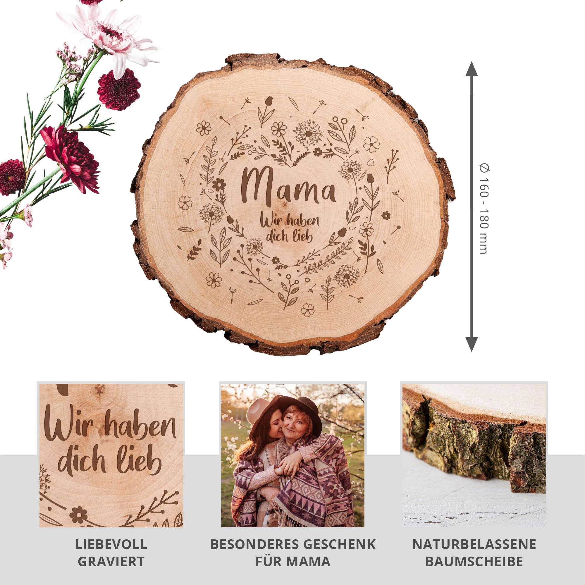 Baumscheiben überzeugen als Kombination aus hoher Funktionalität und einem schönen Naturdesign. Die Rindenscheibe eignet sich als praktischer Untersetzer oder außergewöhnliches Tablett und macht auch als Dekoration optisch einiges her. Die liebevolle Gravur "Mama, wir haben dich lieb" inmitten eines wunderschönen Blumenherzmotivs qualifiziert die Astscheibe als edles Geschenk für deine Mutter, das als naturbelassene Tischdeko mit Rinde für eine natürliche Atmosphäre sorgt.