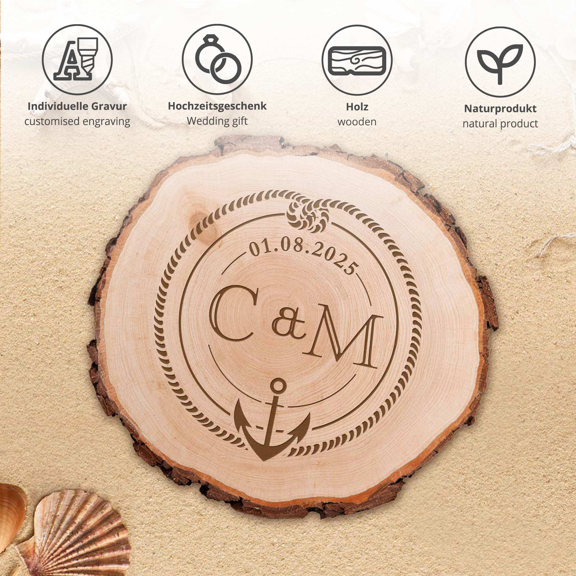 Gemeinsam die Welt entdecken - was könnte es schöneres geben? Unsere Baumscheibe mit Gravur - Monogramm - Anker und Knoten - personalisiert ist daher das ideale romantische Geschenk für alle Paare, die sich gemeinsam auf große Entdeckungsfahrt begeben wollen. Ob als schöne Geschenkidee zum Valentinstag, Geschenk zur Hochzeit oder als Geburtstagsgeschenk für Männer: Unsere Baumscheibe gravieren wir mit Wunschintialen und einem Wunschdatum - ein echtes Unikat für alle Freunde der nautischen Dekoration.