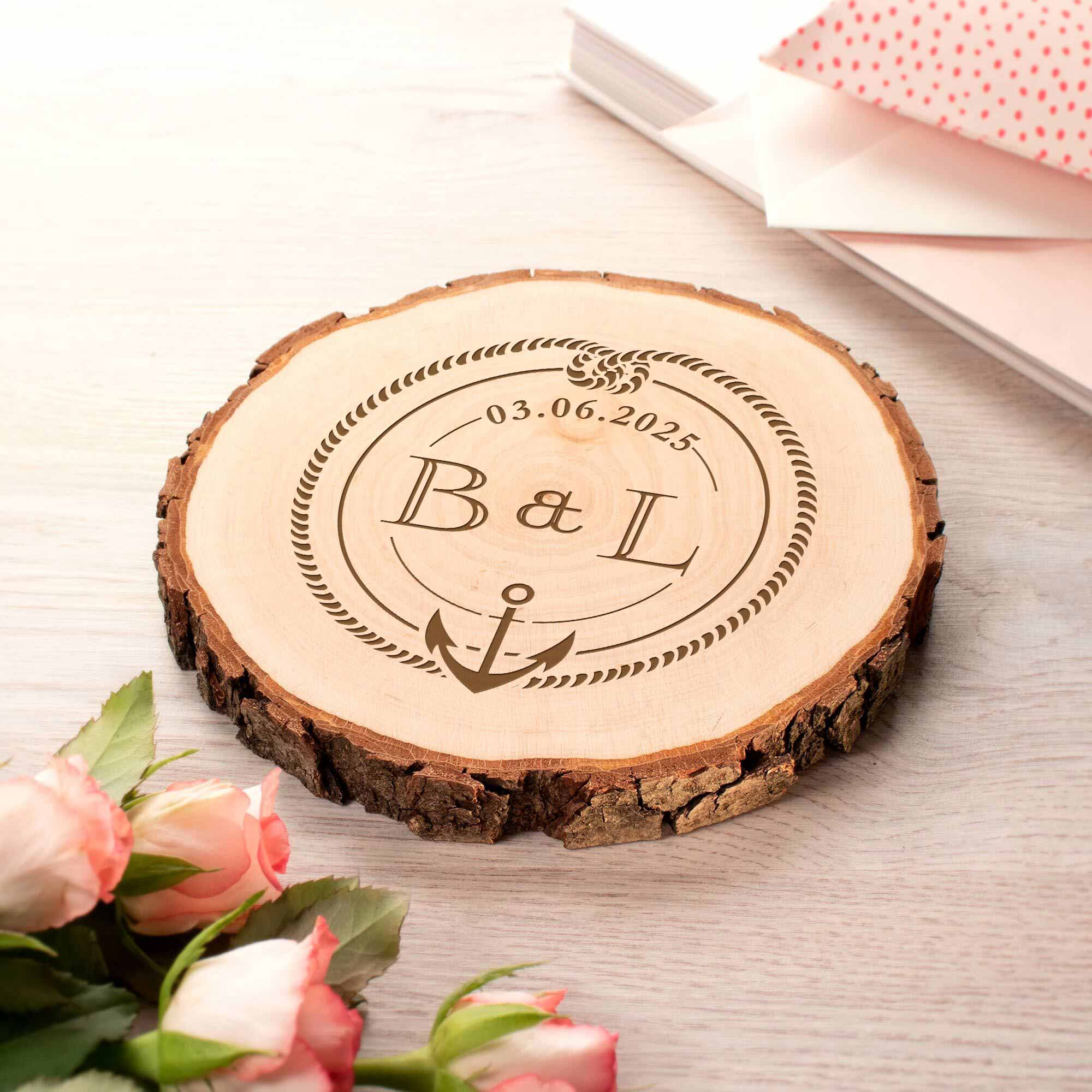Ungewöhnliches romantisches Geschenk gefällig? Für alle, die gemeinsam auf großer Entdeckungsfahrt sind, bietet sich unsere Baumscheibe mit Gravur - Monogramm - Anker und Knoten - personalisiert an.