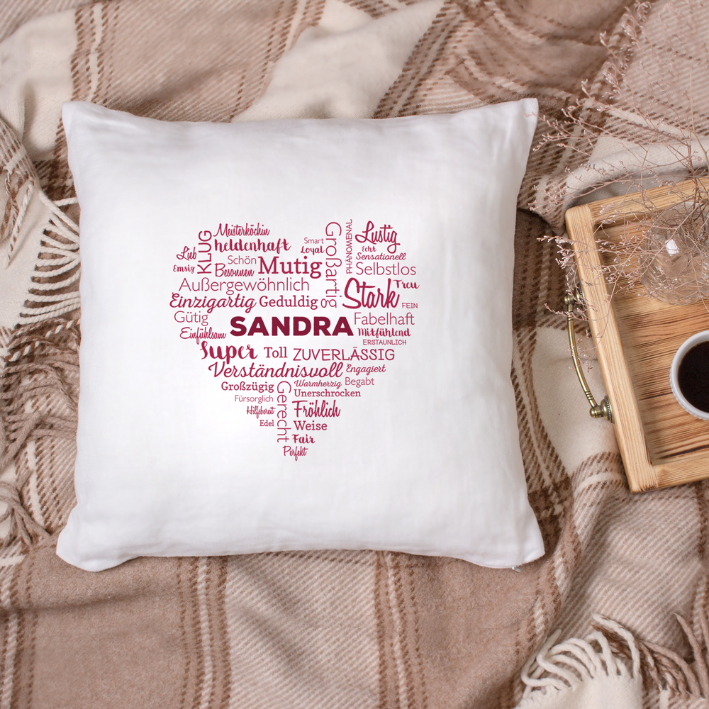 Je besser das Kissen, desto himmlischer ist man gebettet - und unser Bedrucktes Kissen - Wortwolke - personalisiert ist auf jeden Fall ganz vorne mit dabei. Warum? Weil es Komplimente enthält. Und für Sie ganz individuell bedruckt wird. Unser Bedrucktes Kissen - Wortwolke - personalisiert ist in vieler Hinsicht ein schönes und besonderes Stück. Nicht nur ist das Kissen ideal als bequemes Sofakissen oder Kopfkissen einsetzbar. Der Bezug wird auch mit einem schönen Motiv verziert, in dem Komplimente ein Herz formen, und in der Mitte des Herzens wird der Name der Beschenken individuell aufgedruckt. Ideal beispielsweise als Geschenk für Mama, als Geschenkidee für Frauen, oder überhaupt für jeden Menschen, der oder die die Vorteile eines bequemen Kissens zu schätzen weiß - und wer wäre das nicht?