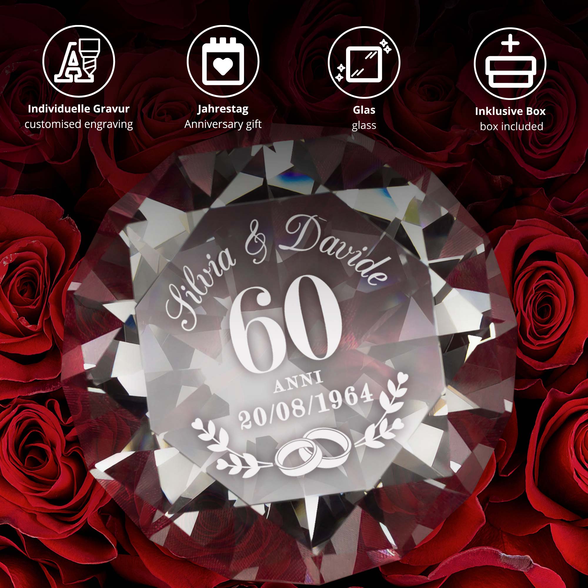 Zur Diamantenen Hochzeit ist dieses edle Geschenkset ein außergewöhnliches Erinnerungsstück an 60 gemeinsame Ehejahre. Der funkelnde Diamantkristall wird mit den Namen des Paares sowie dem Hochzeitsdatum personalisiert und würdigt damit eine lebenslange Verbindung voller gemeinsamer Erinnerungen. Dank seines präzisen Facettenschliffs reflektiert der Kristall das Licht besonders eindrucksvoll und erzeugt eine elegante, funkelnde Wirkung.