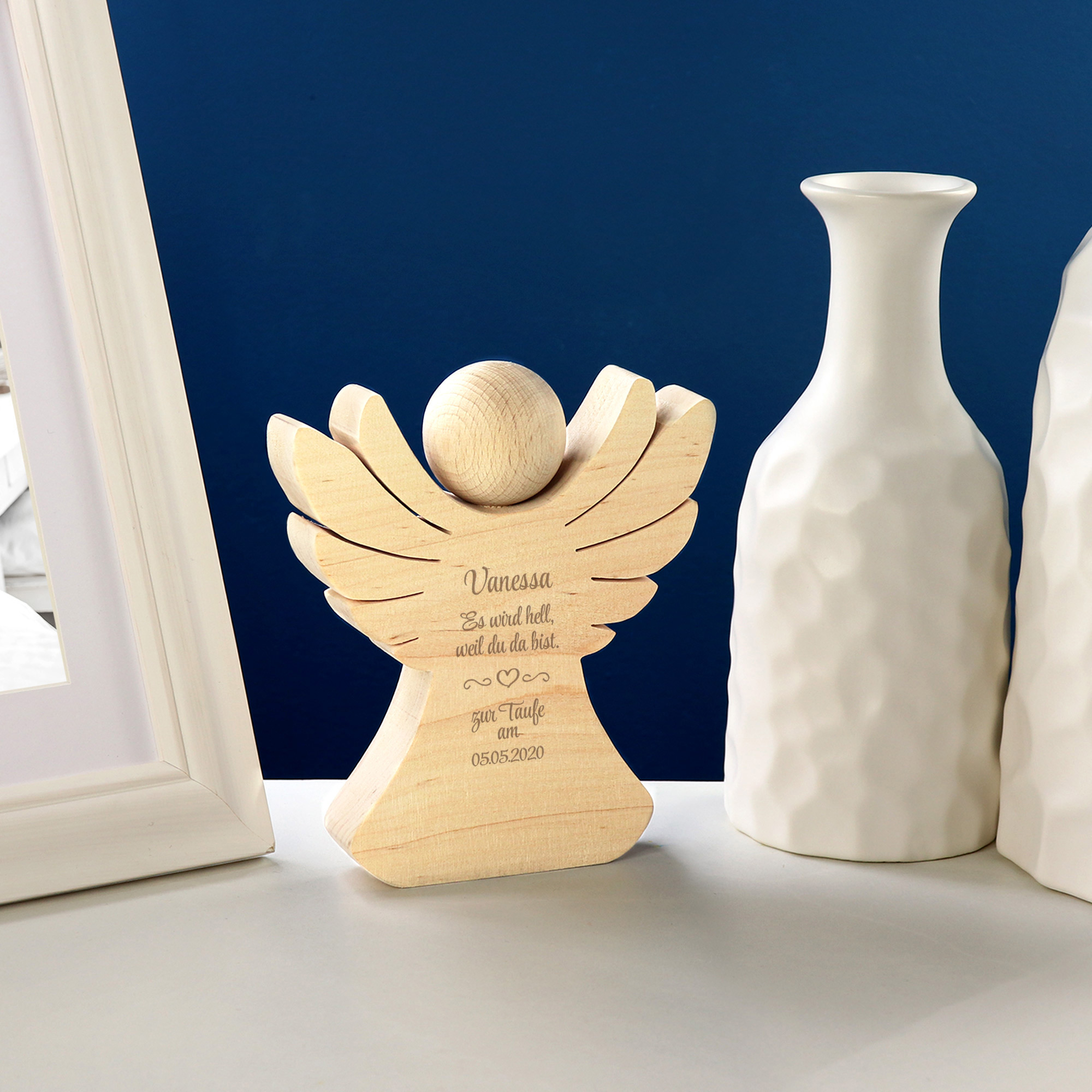 Die Taufe ist ein besonderes Ereignis im Leben eines Menschen. Da ist selbstverständlich auch ein besonderes Geschenk vonnöten. Unser Engel aus Holz mit Gravur zur Taufe - personalisiert, beispielsweise, wird dem oder der Beschenkten sicherlich noch lange Freude bereiten.