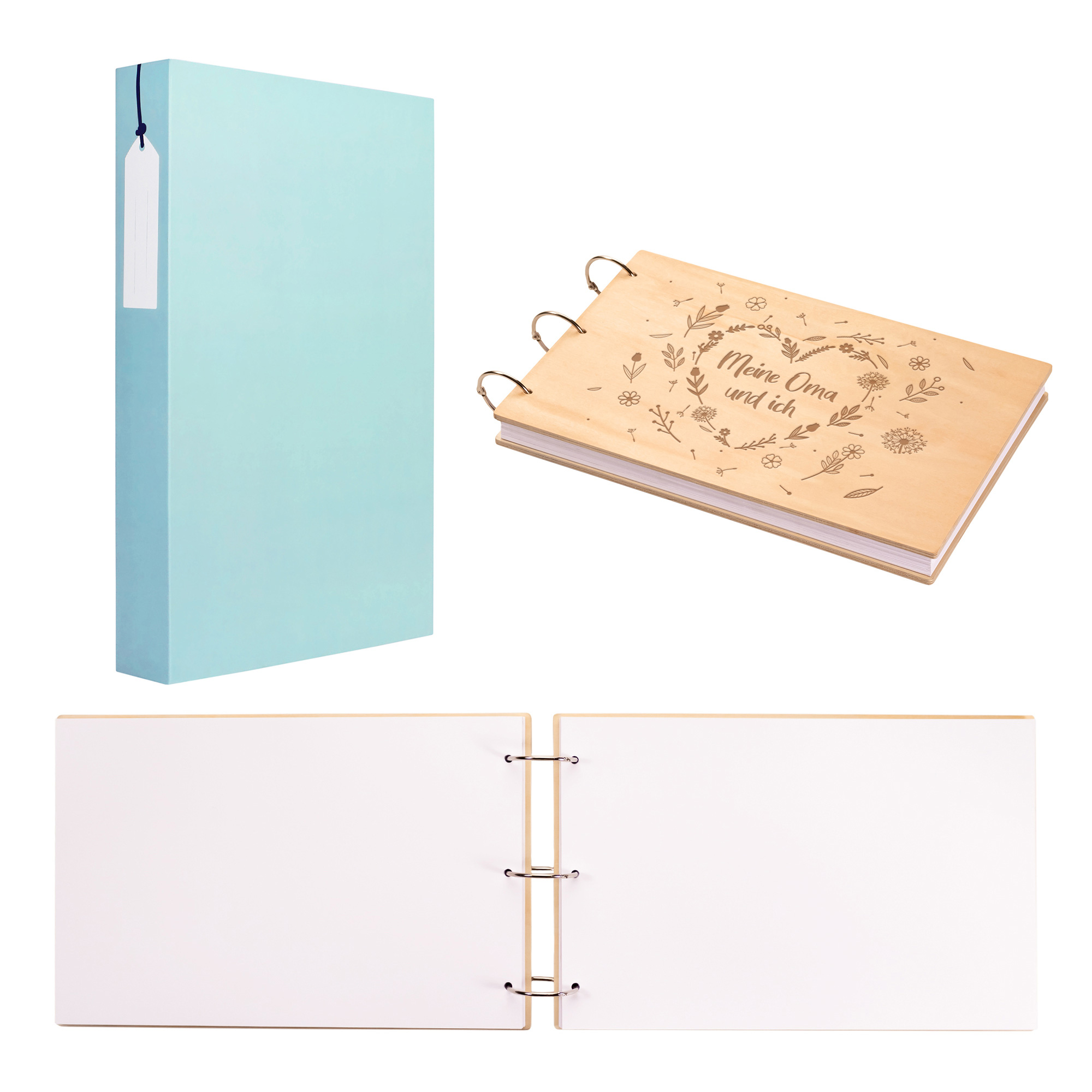 Das Fotobuch wird mit dem edlen Holzcover, der verzierbaren Geschenkbox und der Gravur auf der Vorderseite zum absoluten Highlight bei der Geschenkübergabe. Umgeben von einem gefühlvollen Blumenherz ist auf der Vorderseite des Covers der Schriftzug "Meine Oma und ich" zu lesen, damit jeder weiß, wessen Erinnerungen sich in diesem ganz persönlichen Ringordner verbergen.