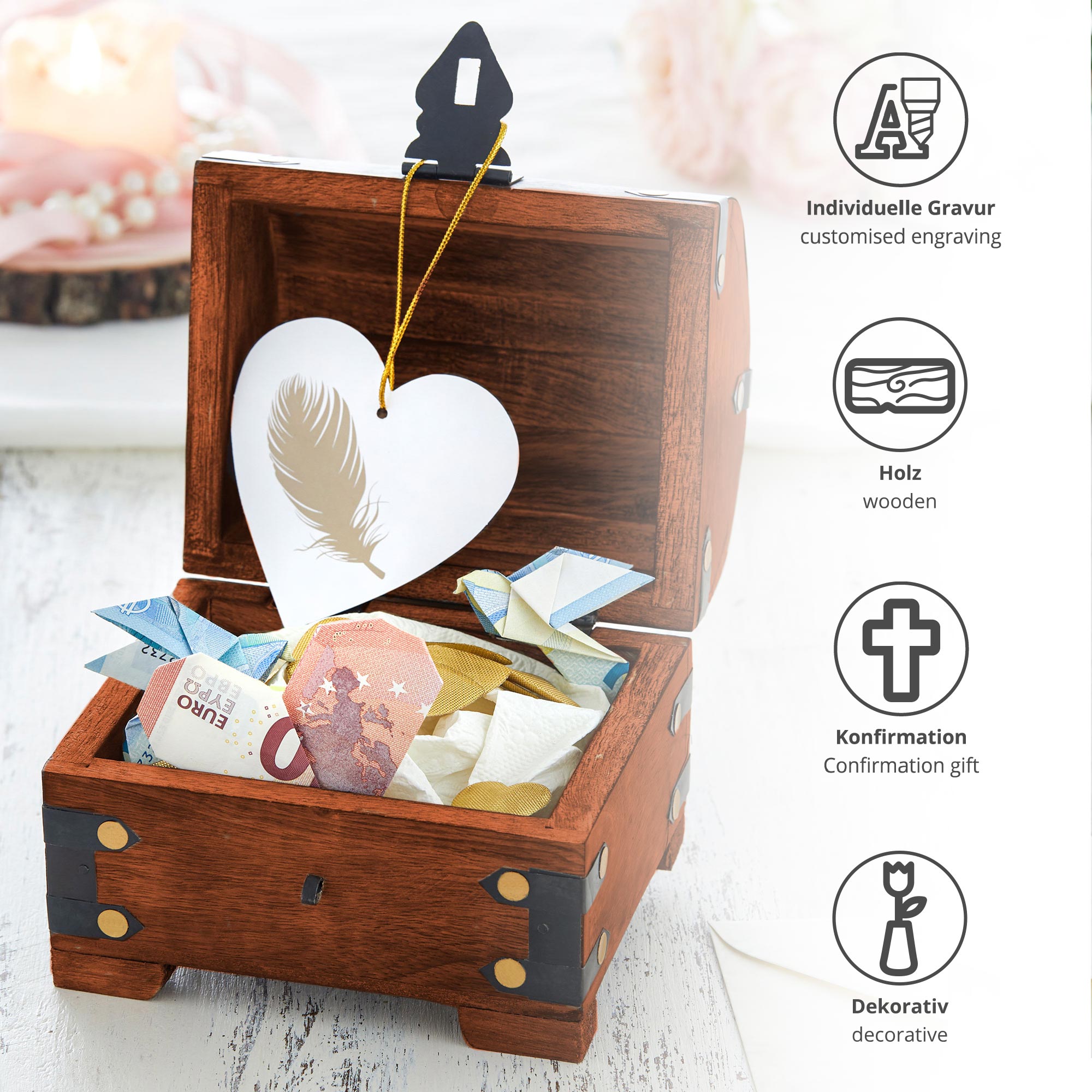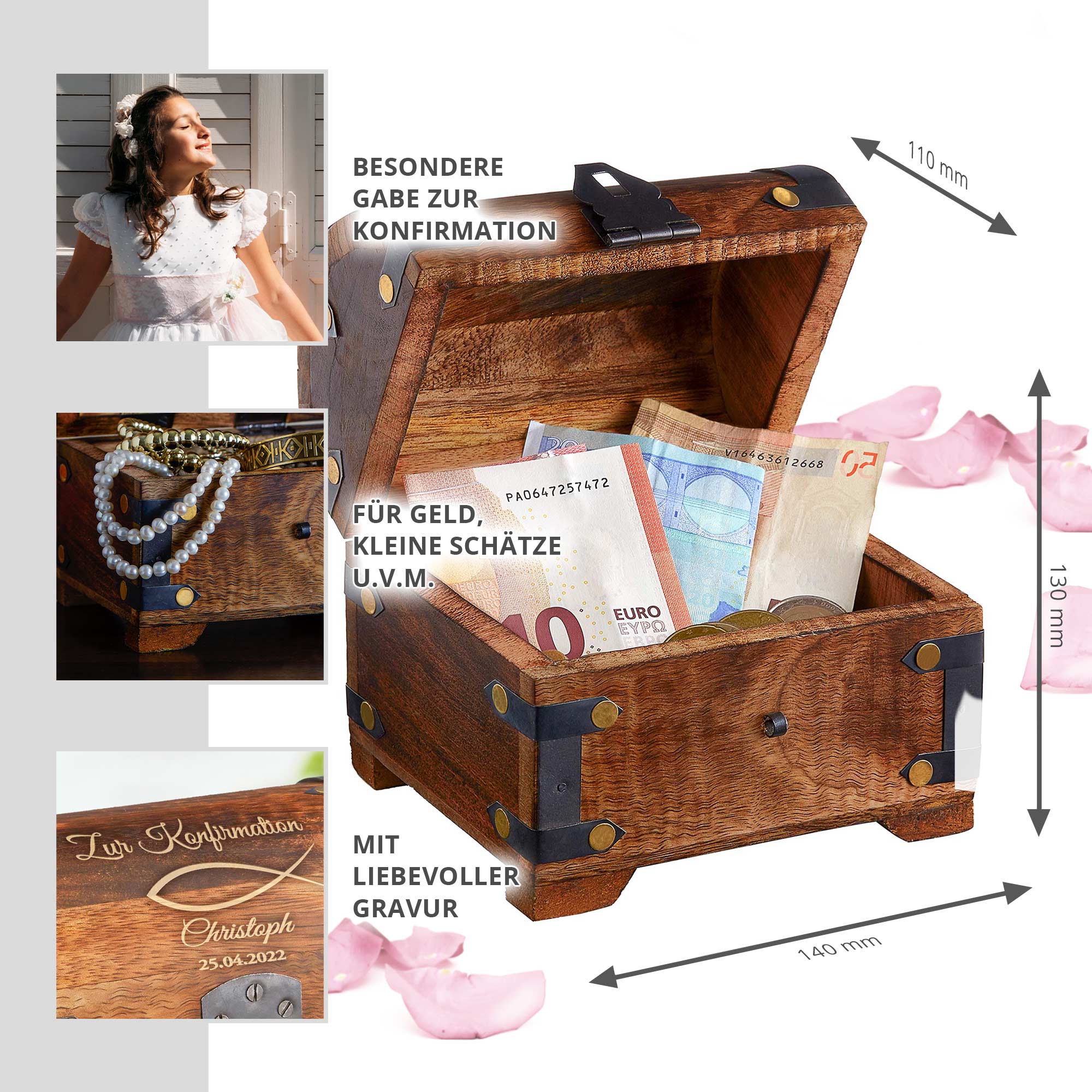 - Schatztruhe aus hochwertigem dunklen Holz als Geschenk zur Konfirmation