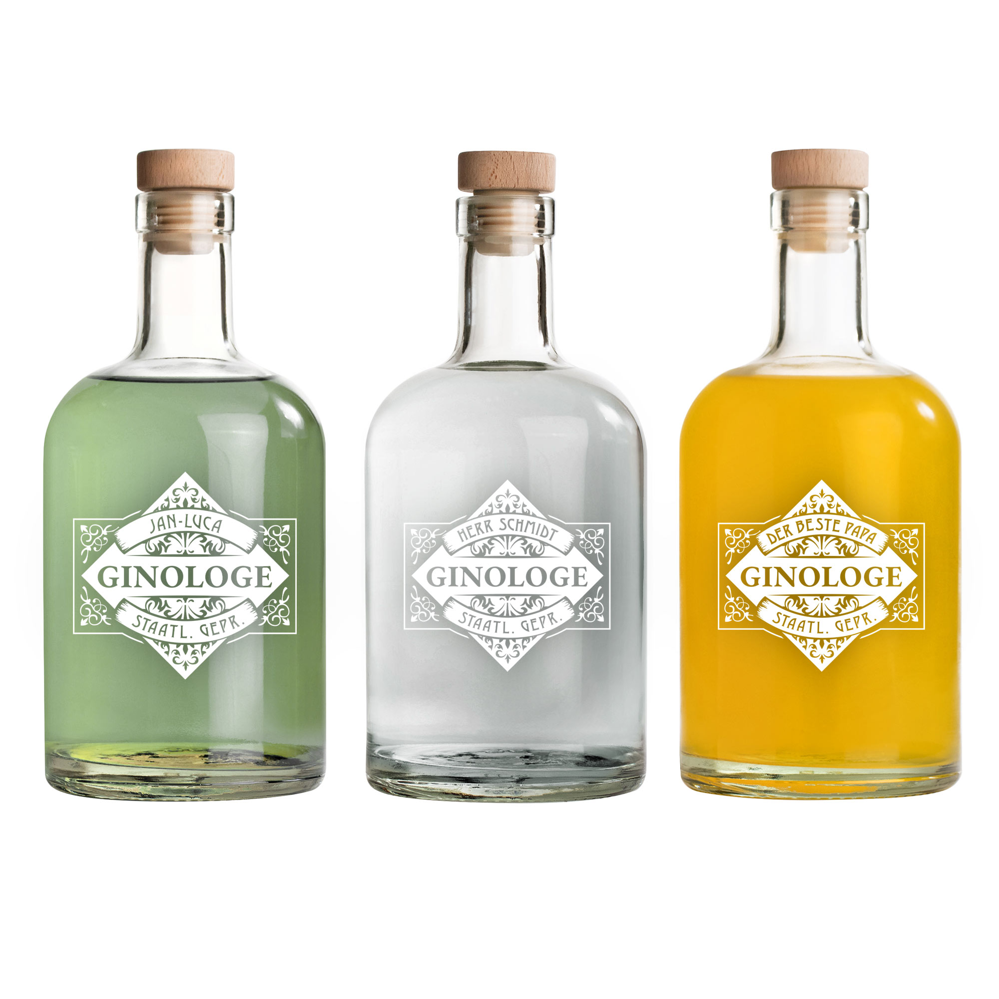 - Glasflasche mit Gravur "GINOLOGE – Staatl. gepr."