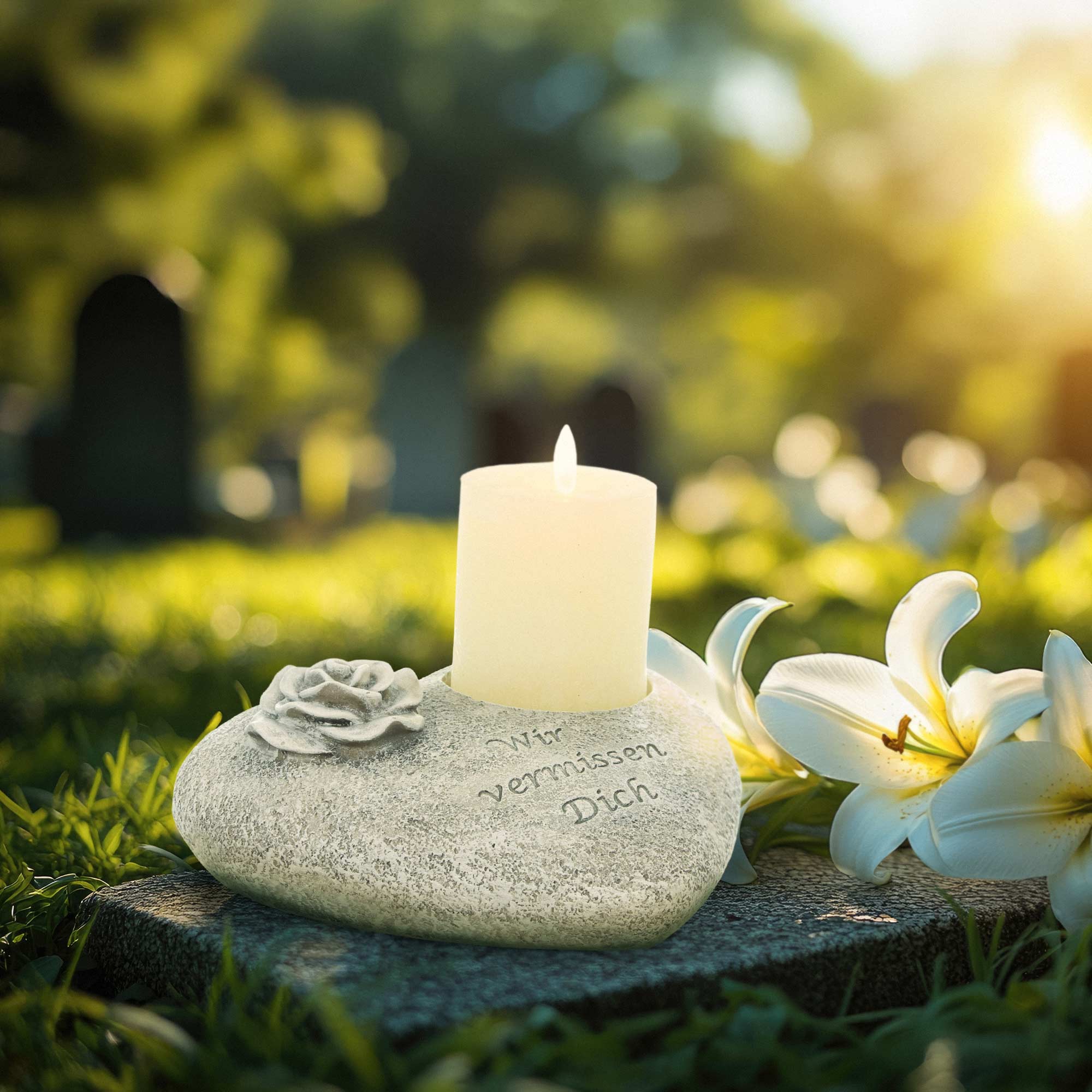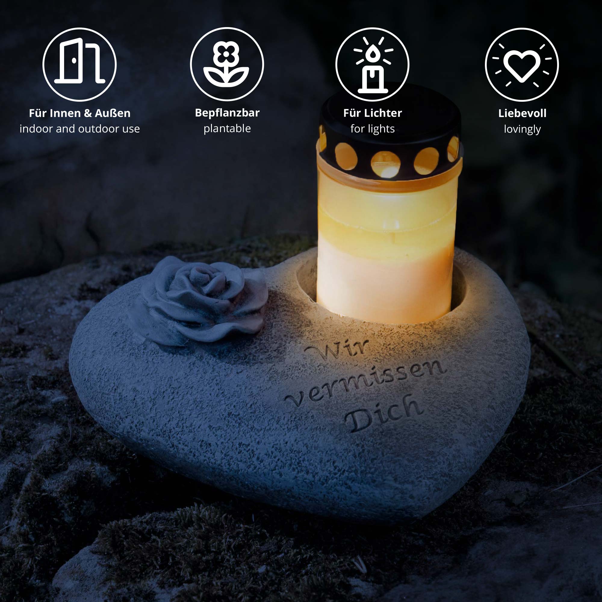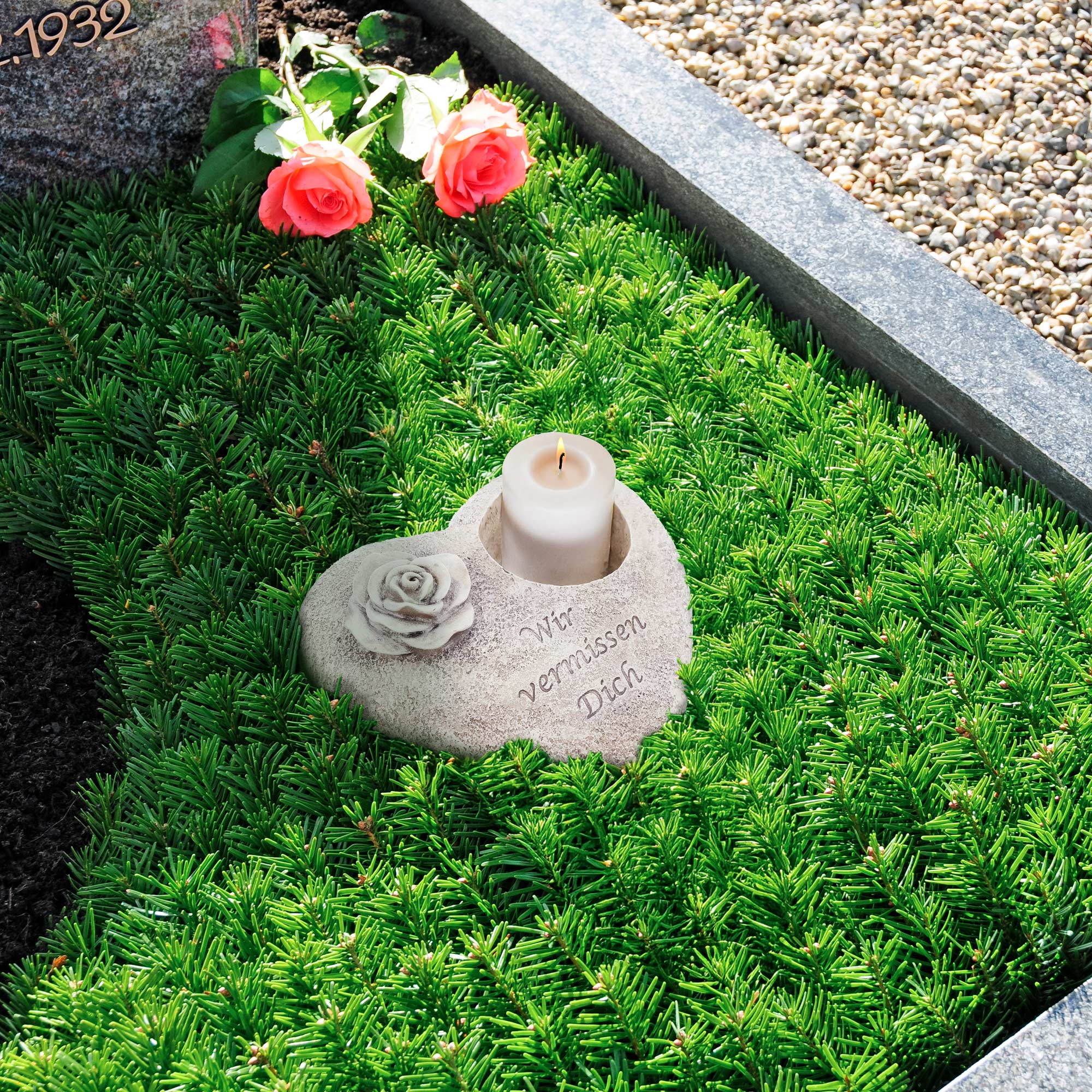 In der Mitte des Trauerherzens befindet sich eine integrierte Aussparung mit einem Durchmesser von ca. 7 cm – ideal für handelsübliche Grabkerzen oder Teelichter. Die Oberfläche ist wetterfest und pflegeleicht, sodass sich das Herz für den dauerhaften Einsatz im Außenbereich eignet. Ob auf dem Grab oder im persönlichen Gedenkbereich – dieses Grabherz ist ein wertvolles Andenken, das Licht und Erinnerung auf würdevolle Weise vereint.