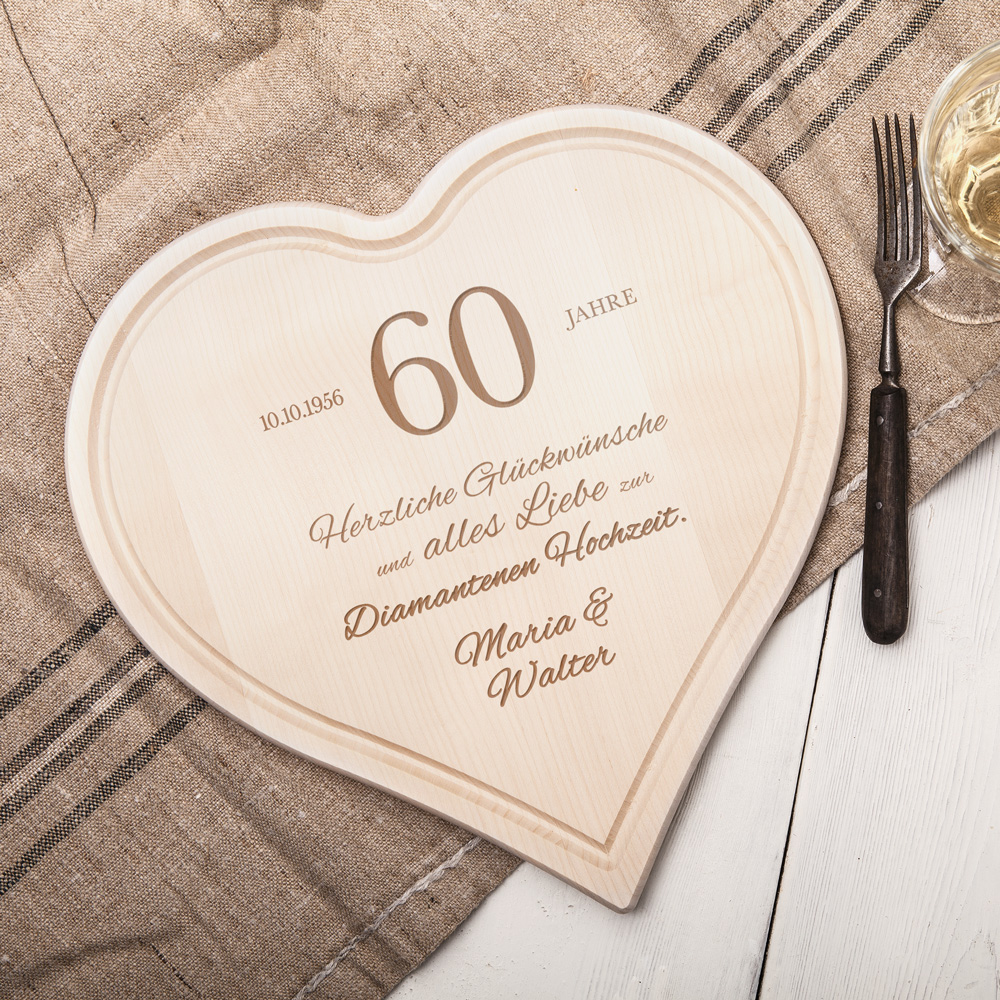 60 Jahre sind eine lange Zeit - es kann sich glücklich schätzen, wer dann immernoch mit einem geliebten Menschen zusammen kochen kann. Unser Herzbrett mit Gravur - Diamantene Hochzeit - Personalisiert ist eine perfekte Grundlage dafür. Es ist stabil, der tägichen Belastung in der Küch mehr als gewachsen - und ein ganz besonderes Geschenk, dass 60 Jahre Liebe würdig feiert.