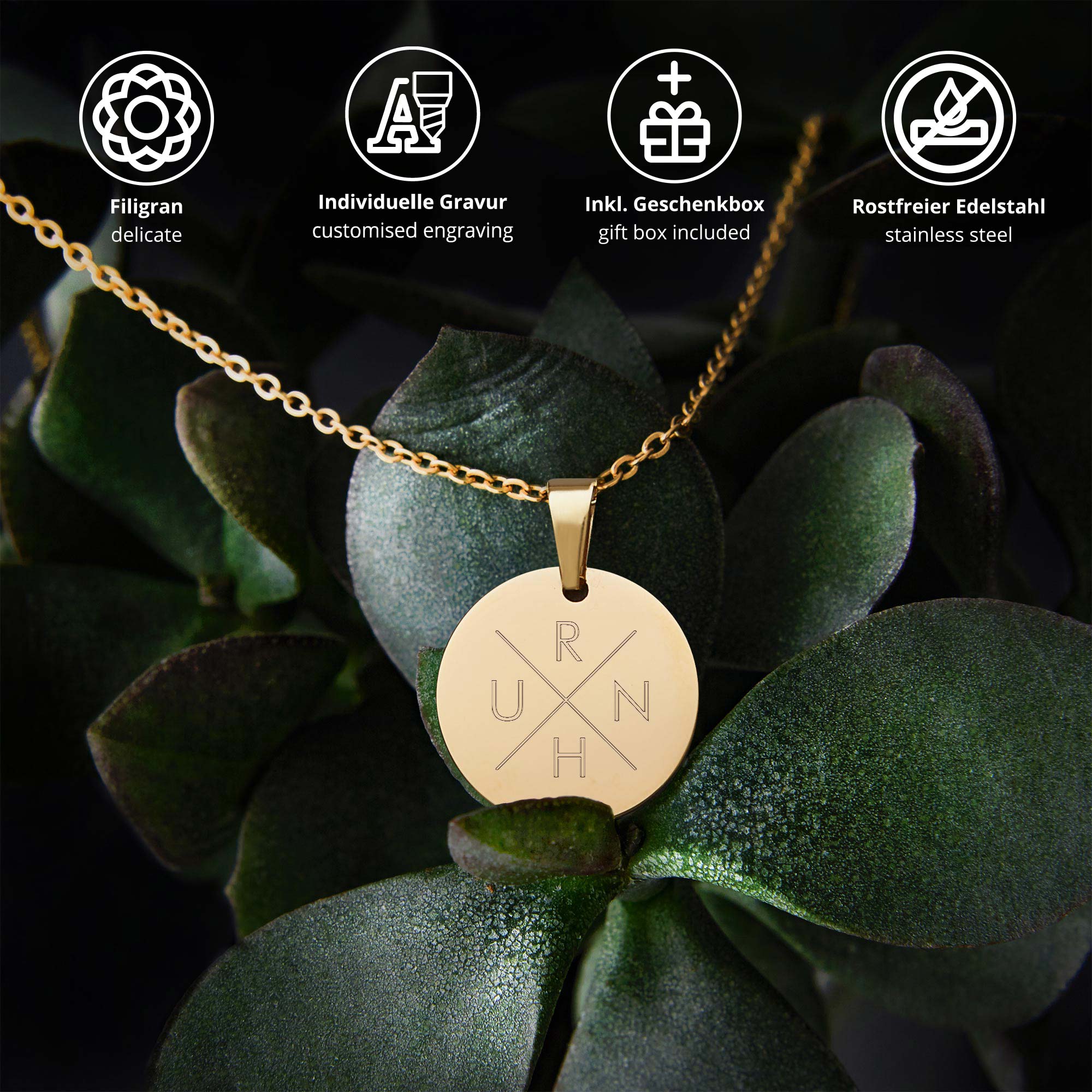 Wähle bedeutsame Buchstaben oder Zahlen und verewige die Zeichen auf dem kreisrunden Kettenanhänger. Seien es Initialen, Anfangsbuchstaben oder Daten - Die hochwertige Gravur verleiht der goldenen Damenkette eine persönliche Note. Überrasche Deine Frau, Partnerin oder beste Freundin mit der einzigartigen Goldkette für pure Begeisterung!