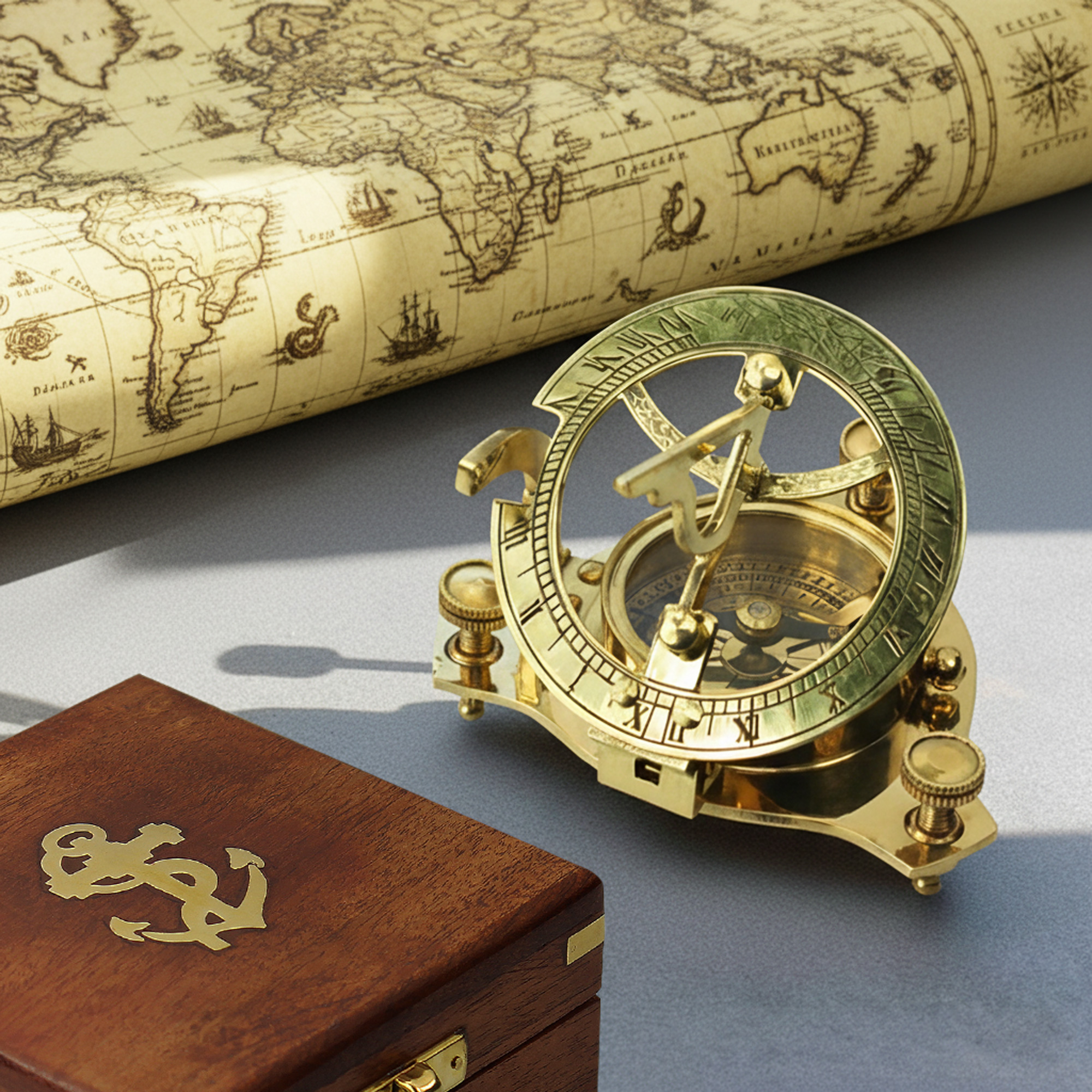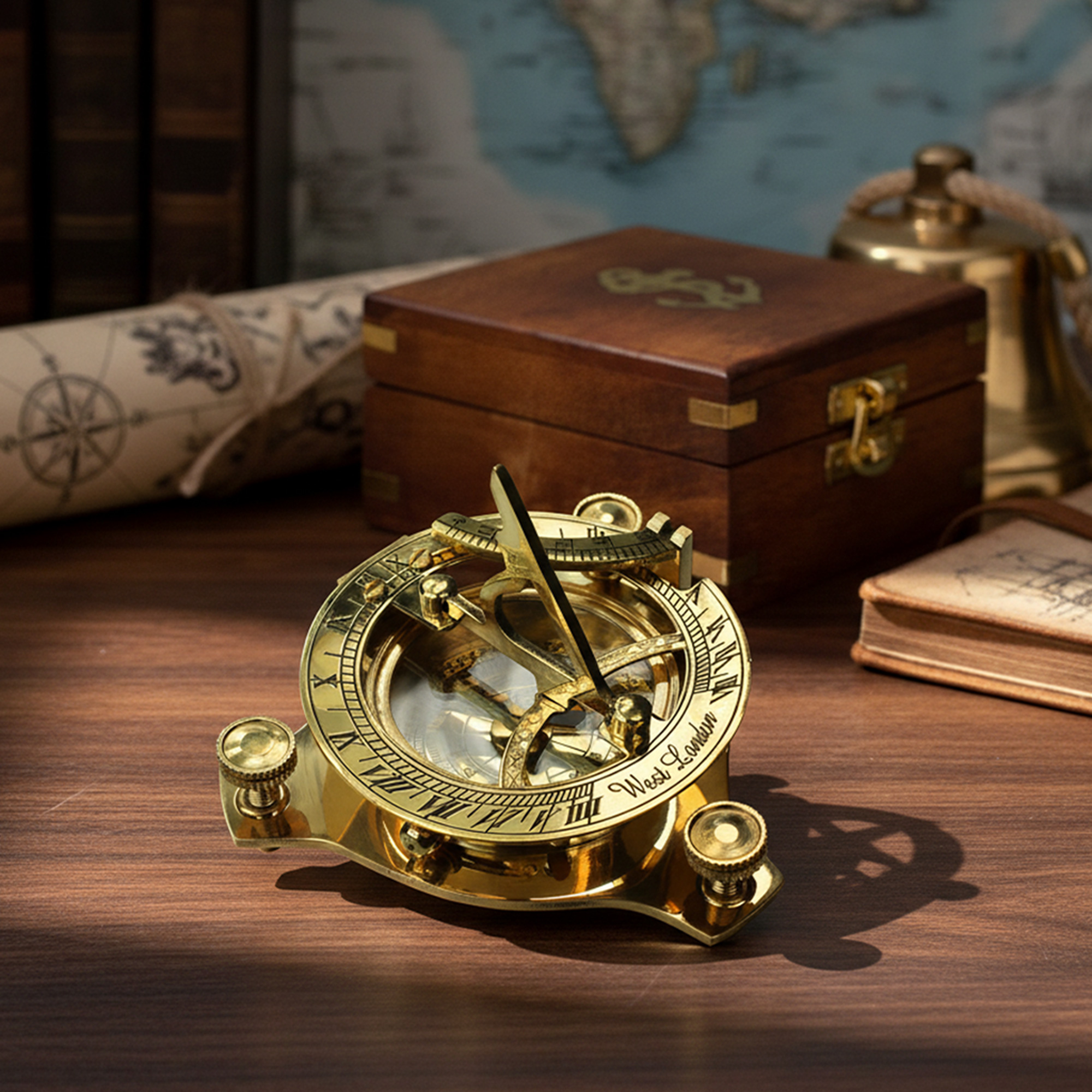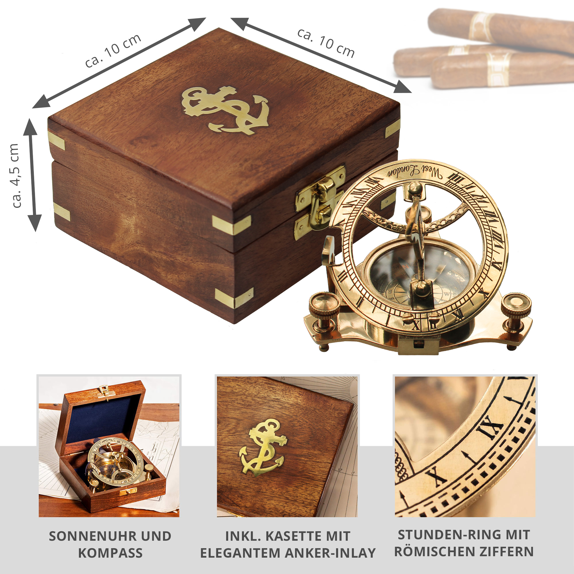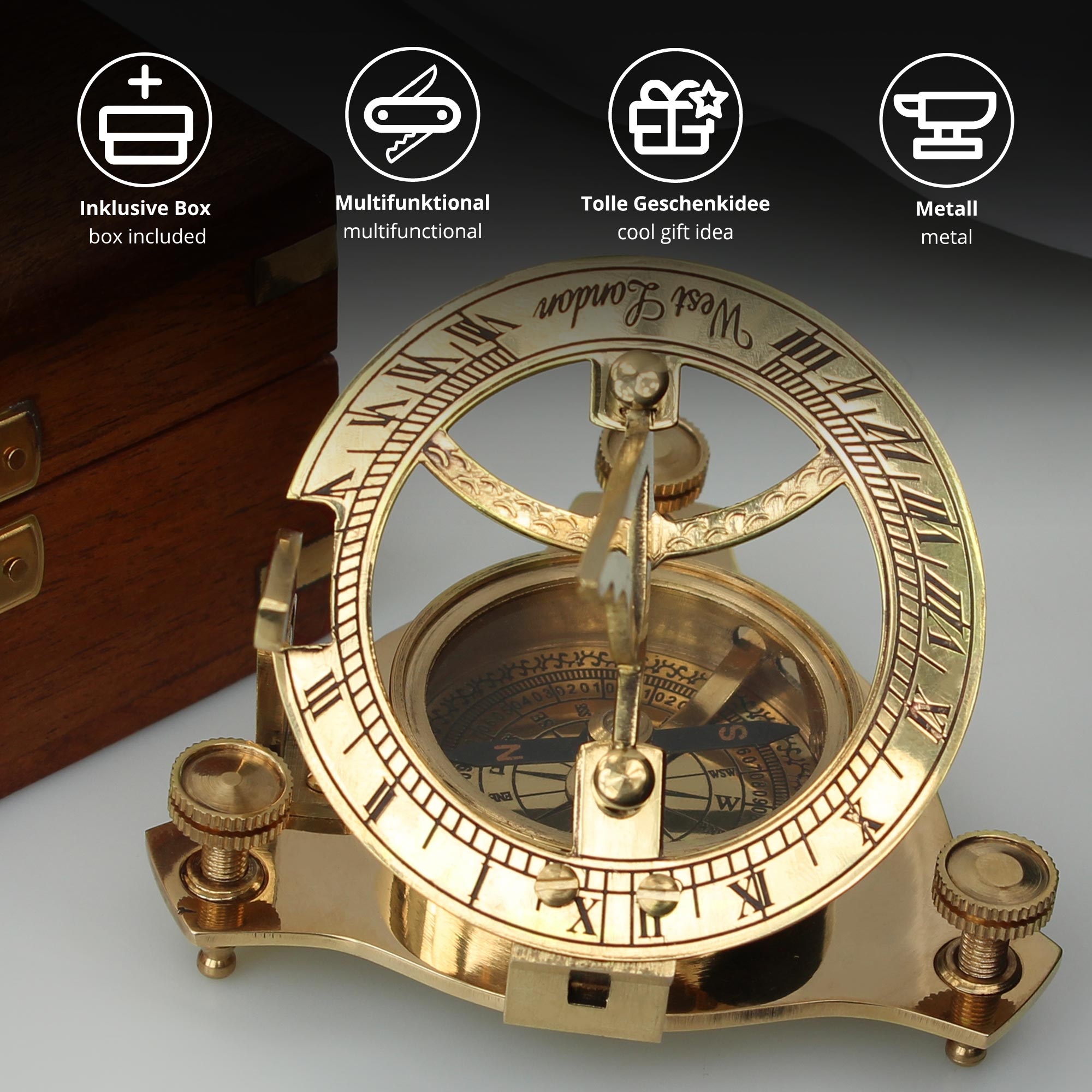 Eine besondere Geschenkidee in altehrwürdiger Goldoptik mit passender Geschenkbox in schlichtem Holzdesign. Übergebe die außergewöhnliche Taschensonnenuhr direkt in der stilvollen Box und überrasche abenteuerlustige Entdecker zu Geburtstagen, Weihnachten oder anderen Feierlichkeiten.