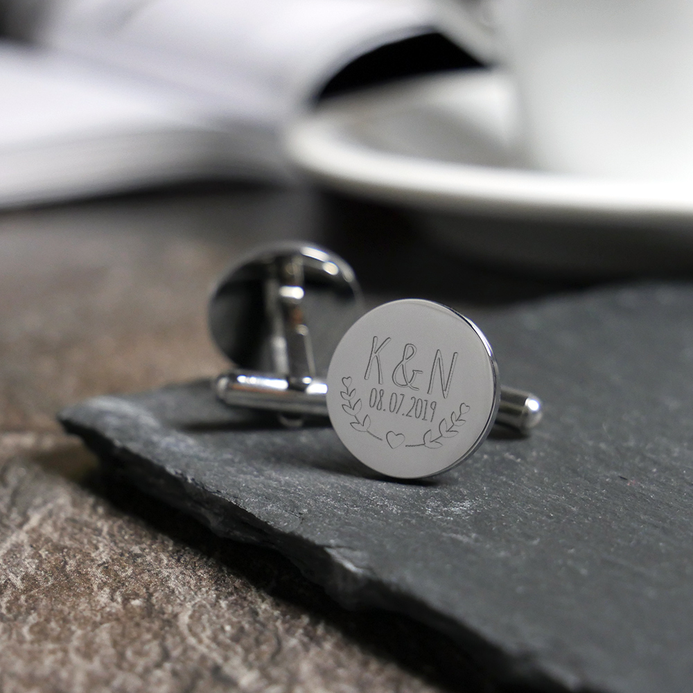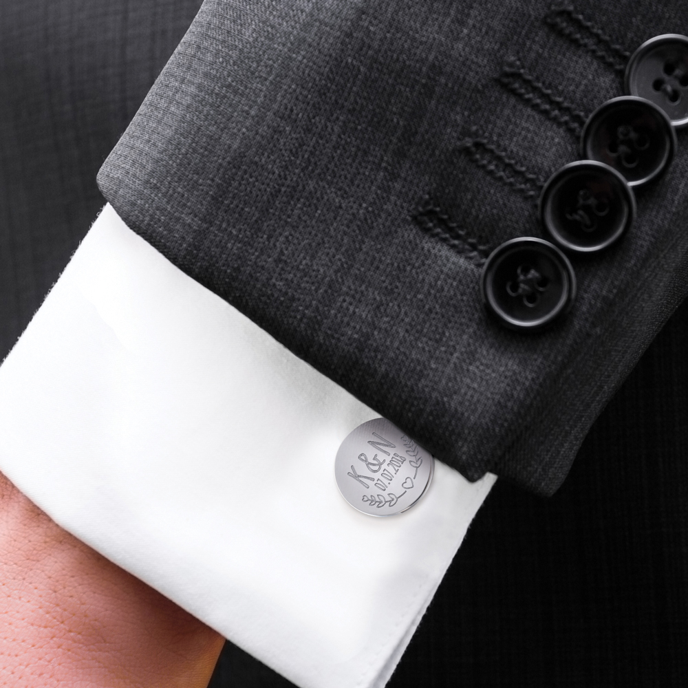 Wenn es feierlich werden soll, gilt für den Herren: Manschettenknöpfe sind ein Muss! Vor allem bei Hochzeiten sind sie ein unverzichtbares Accessoire. Ganz individuell dabei: Die Manschettenknöpfe mit Gravur zur Hochzeit - Blätter - Rund - Silber.