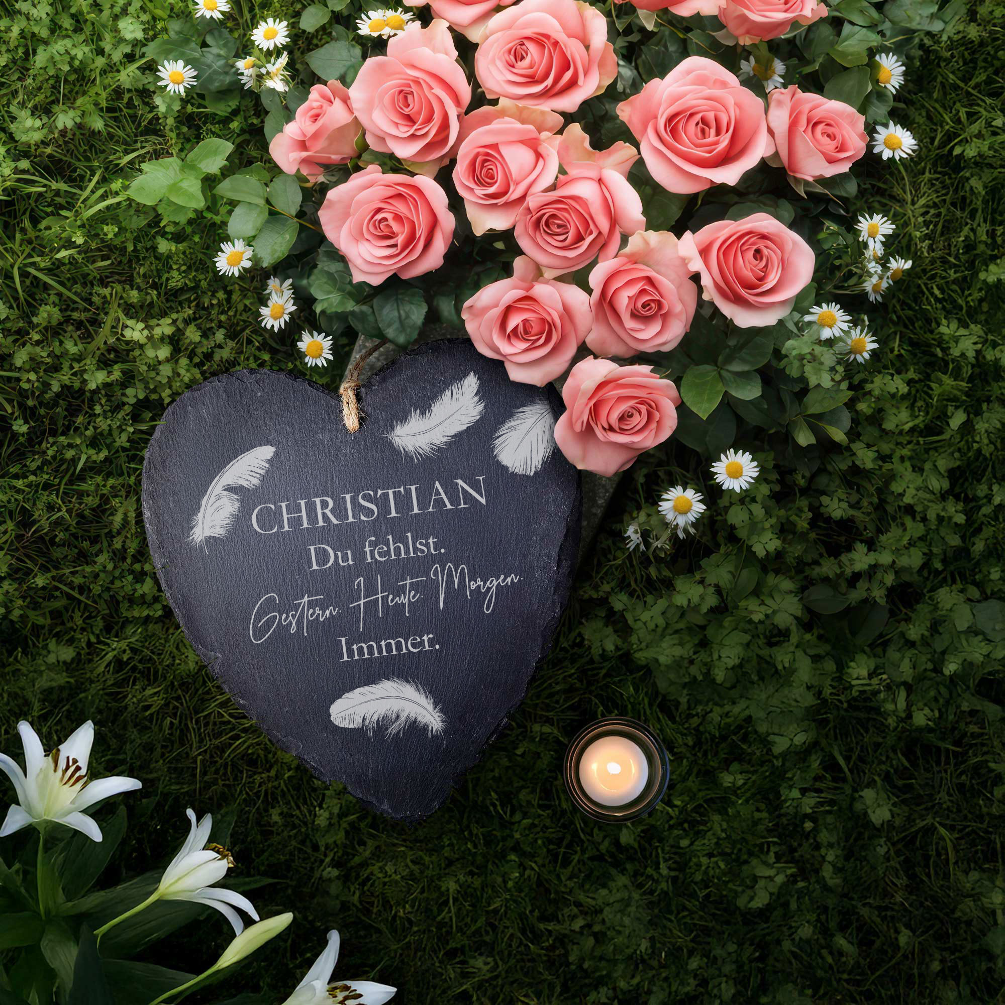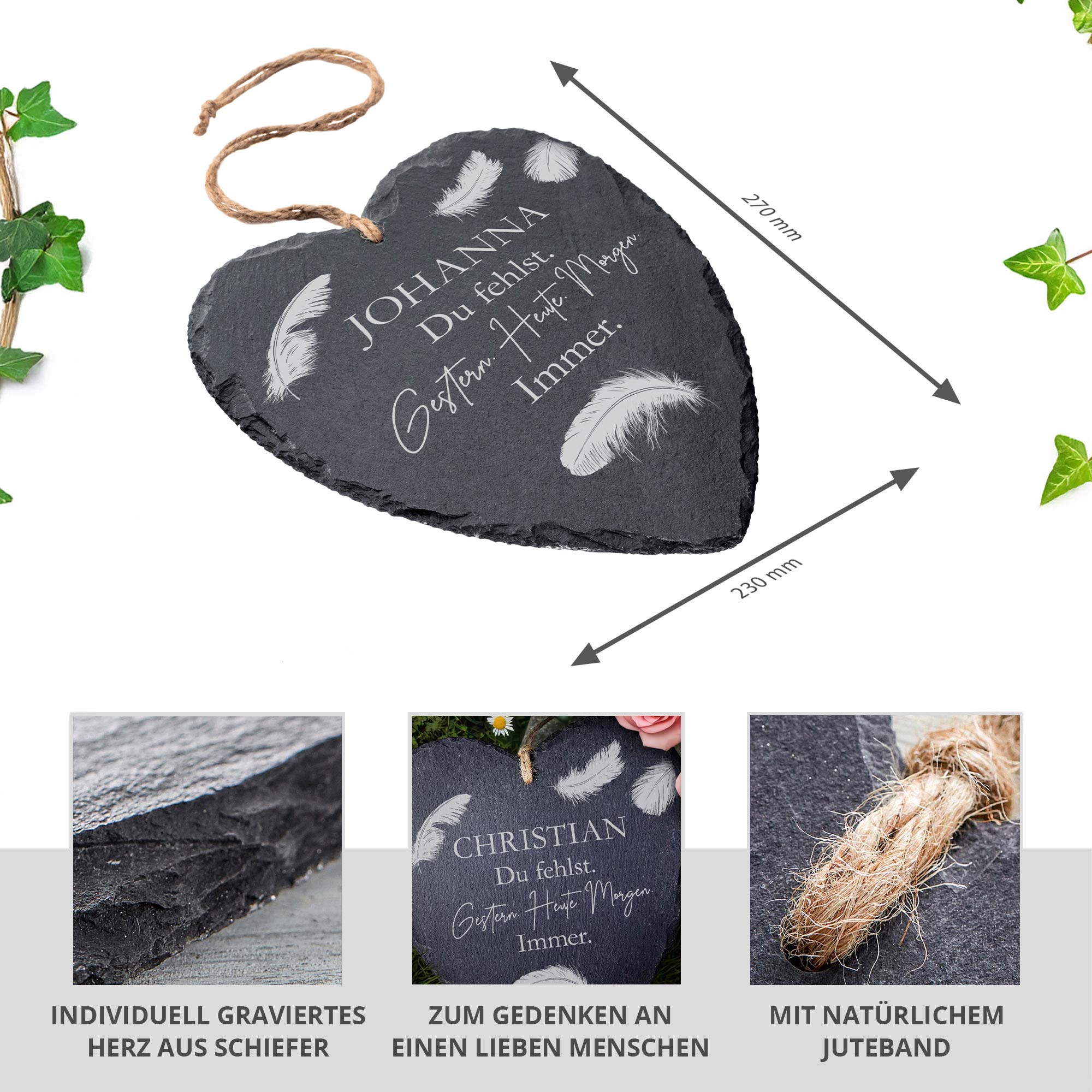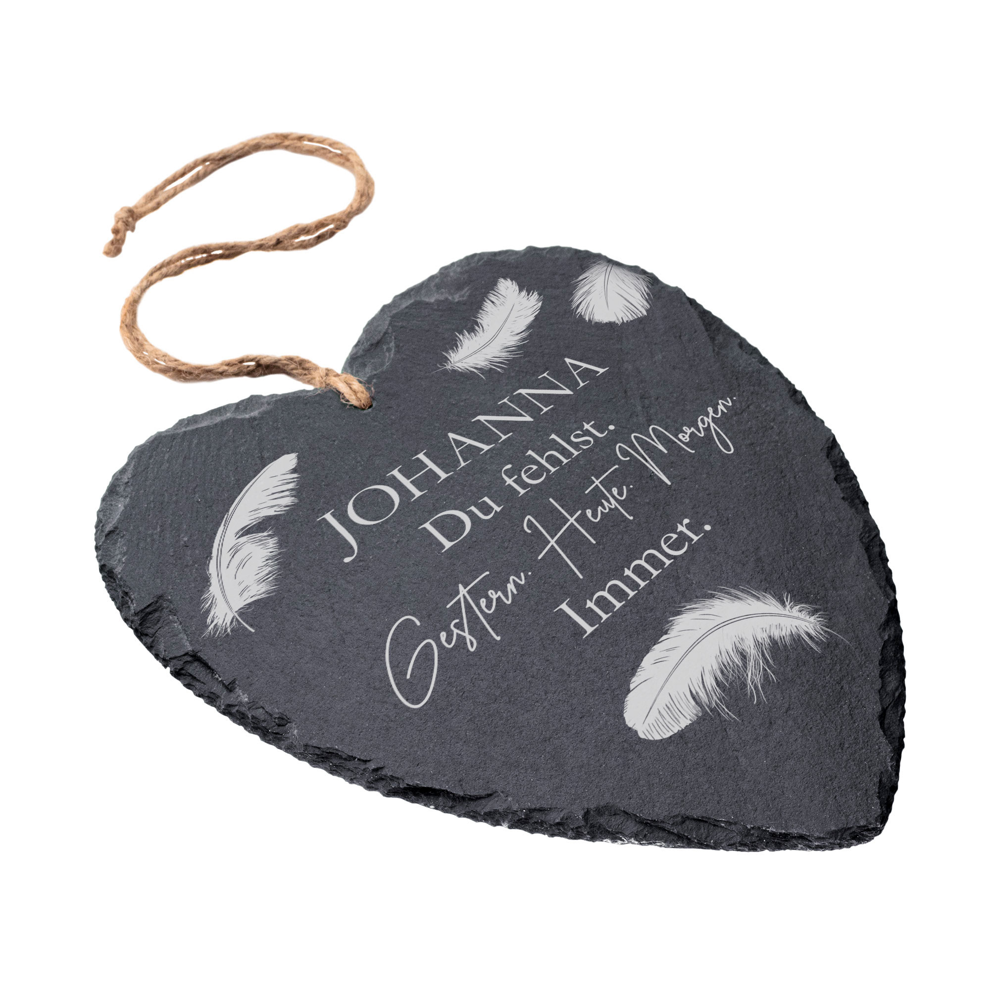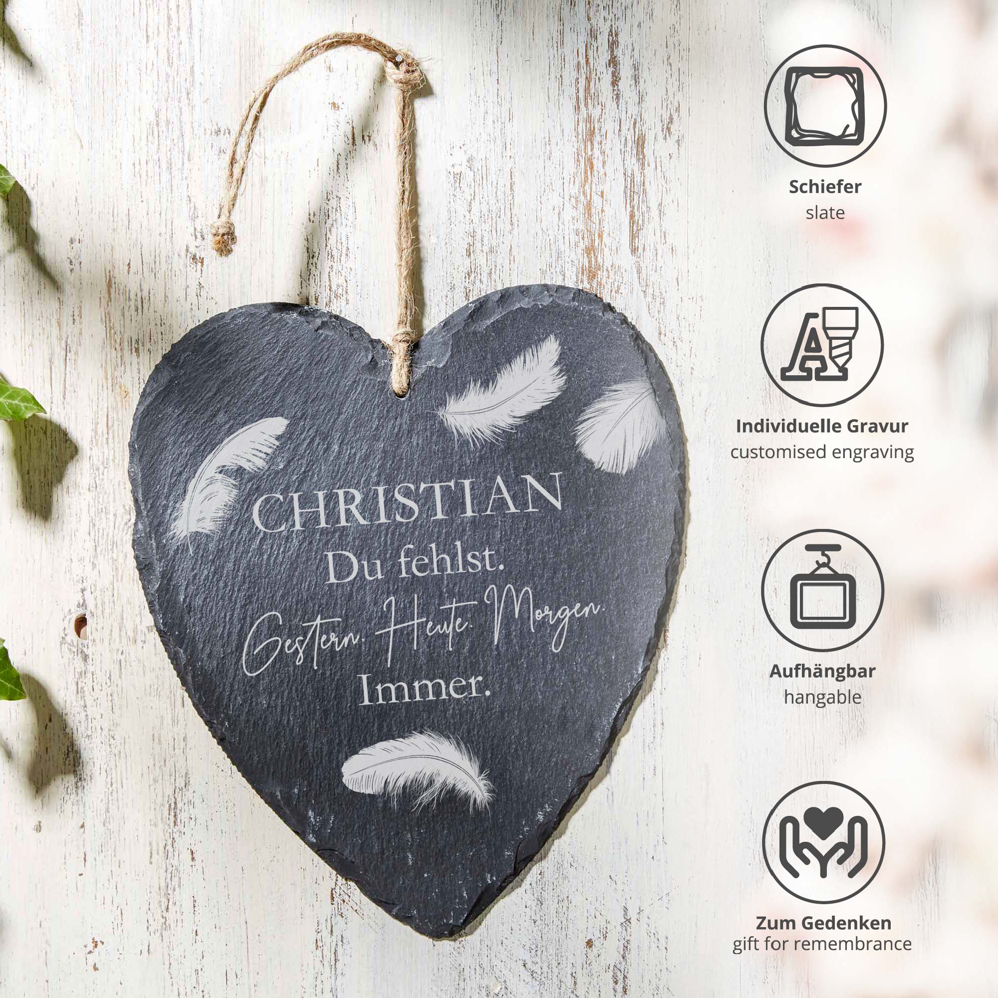 Dieses liebevoll gestaltete Schieferherz mit der Gravur "Du fehlst. Gestern. Heute. Morgen. Immer." bietet einen stilvollen Weg, Ihre persönliche Erinnerung an einen geliebten Menschen auf besondere Weise festzuhalten. Der naturbelassene Schiefer verleiht der Gedenktafel eine authentische und zugleich zeitlose Ausstrahlung. Durch die individuelle Namensgravur wird das Trauerherz zu einem ganz persönlichen Andenken, das auf dem Grab, an einer Gedenkstätte oder im heimischen Garten einen würdevollen Platz findet.