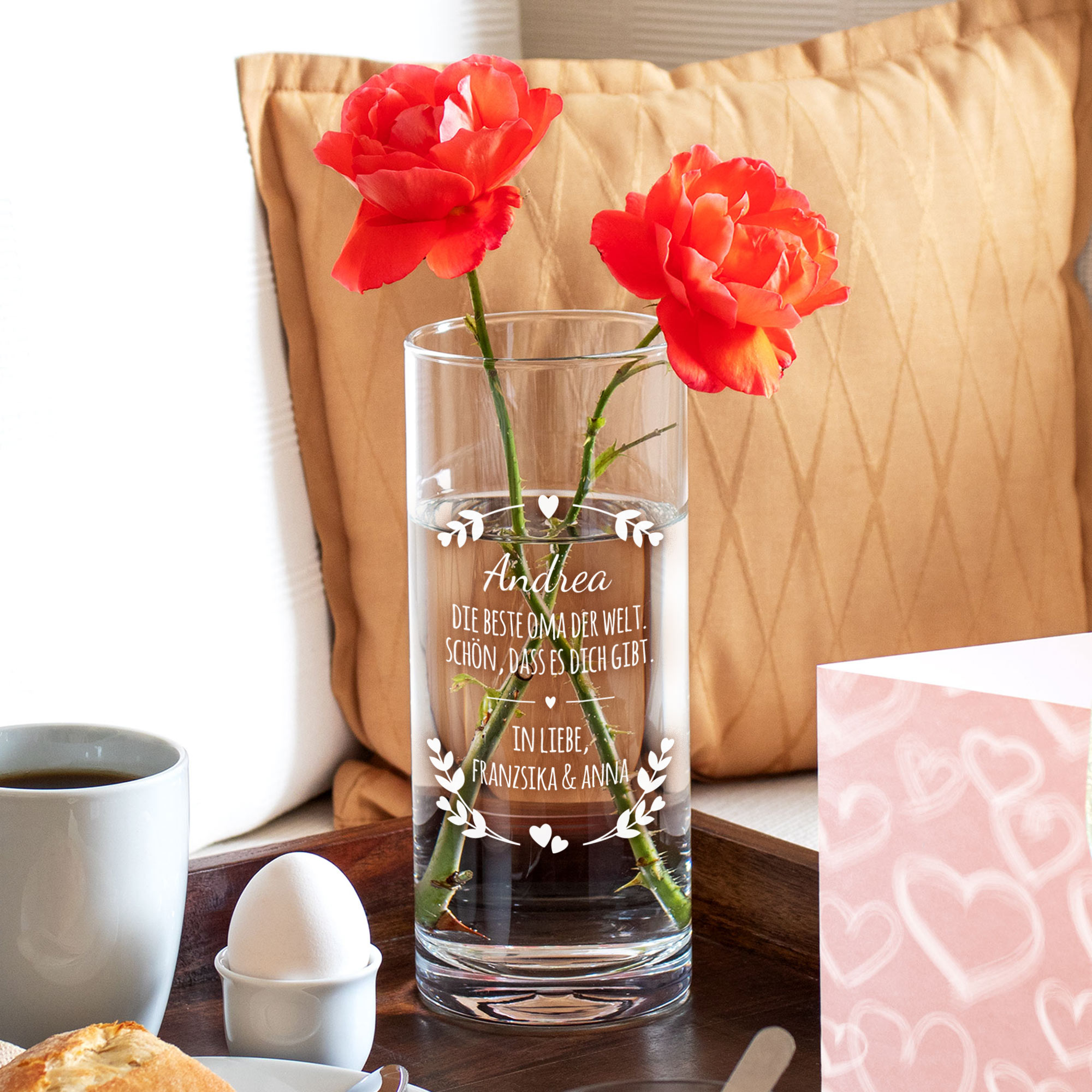 Was kann ich meiner Oma zum Jubiläum schenken? Eine Vase mit Gravur als personalisierte Blumenvase ist die passende Geschenkidee für Dich. Die kleine Vase kannst Du mit dem Vornamen Deiner Lieblingsoma und gleichzeitig den Namen der/s Enkel/s mit einer formschönen Lasergravur verzieren lassen. Weil es zum Jubiläum der Oma meist Blumengeschenke gibt, findet Deine geschmackvolle Glasvase garantiert sofort Verwendung.
