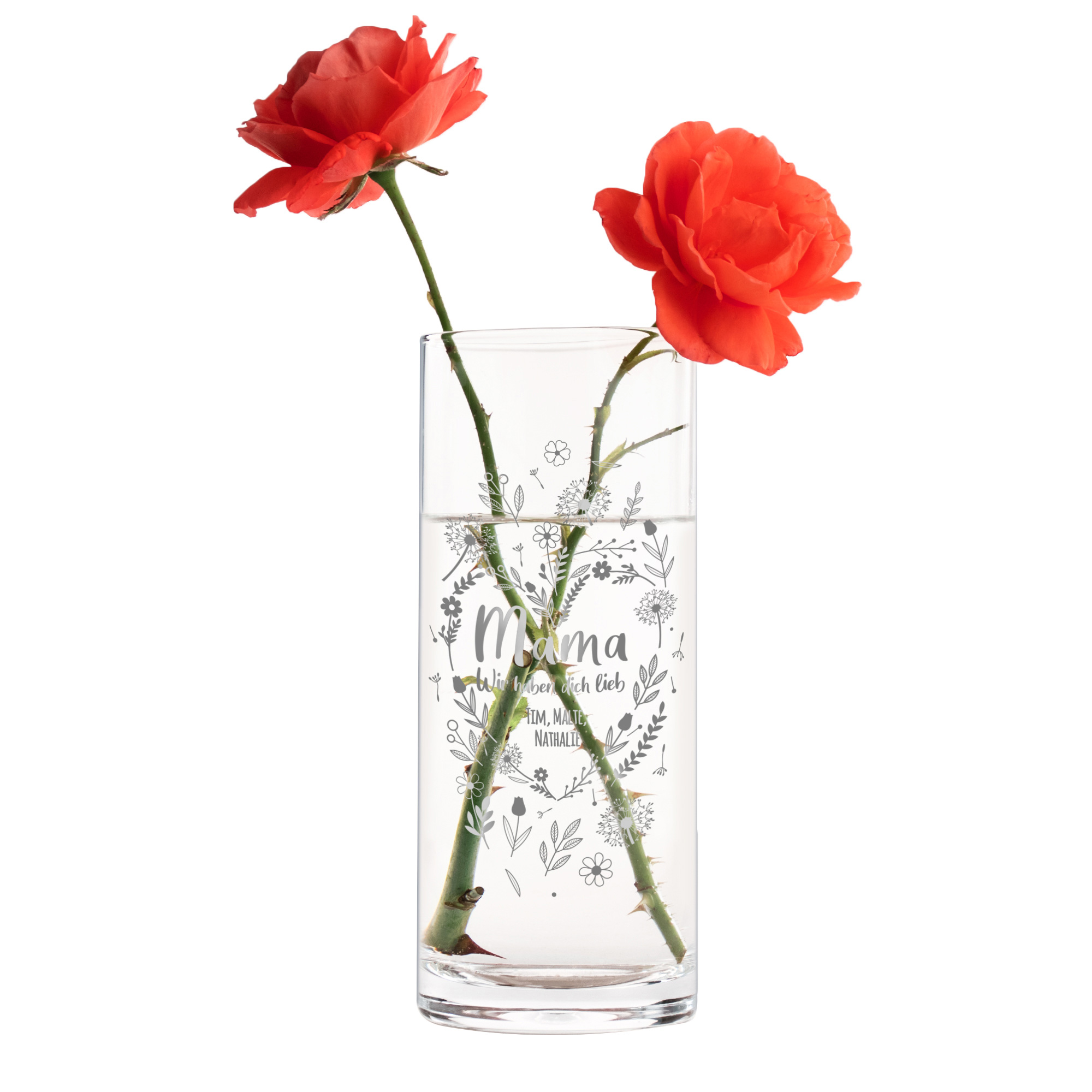 Was kann ich meiner Mama zu Weihnachten schenken? Eine hochwertige Blumenvase mit persönlicher Widmung ist Dein perfektes Weihnachtsgeschenk. Die runde Vase sieht durch das eingravierte Herz aus Blumen sehr liebevoll aus und liefert die Antwort auf die Frage: was kann ich Mama zum Muttertag schenken? Unsere Vase mit Gravur ist genau das richtige Präsent zu vielen Anlässen. Die kleine Vase mit den Namen der Kinder und der niedlichen "Wir haben dich lieb" Widmung für die beste Mutti der Welt ist als Geschenk zum Muttertag unschlagbar!