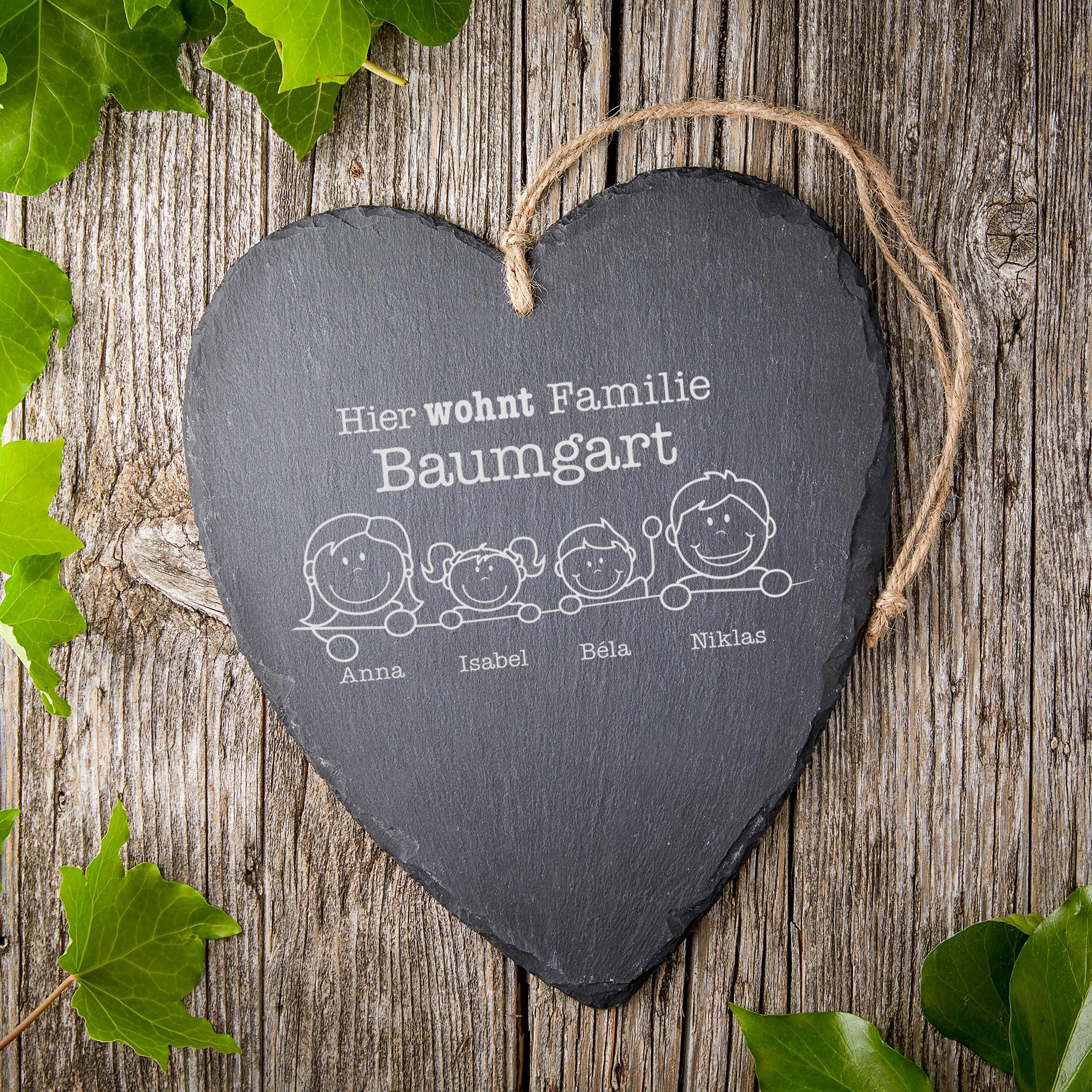 Am schönsten ist es immer noch Zuhause, denn die Familie gibt einem Halt. Dank der individuellen Gravur auf dem Türschild in Herzform zum Aufhängen wissen Gäste direkt Bescheid, wer alles Teil der Familie ist. Familie ist Zusammenhalt! Unser Schieferherz mit Gravur – Hier wohnt Familie – Personalisiert zeigt den Gästen die glückliche Familie, die in dem jeweiligen Haus oder der Wohnung wohnt. Das Wandschild wird mit den Namen der Familienmitglieder sowie süßen Comic-Zeichnungen individuell graviert. Die Gravur verwandelt das Schild in ein echtes Unikat und damit in eine tolle Geschenkidee, zum Beispiel zum Einzug oder zum Umzug.