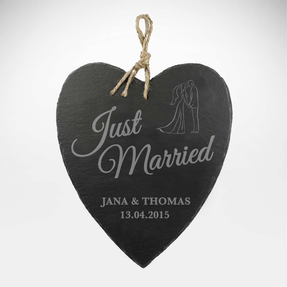 Eine stillvolle Erinnerung an den schönsten Tag des Lebens? Wie wäre es mit unserem Schieferherz zur Hochzeit mit Gravur - Just Married - Personalisiert? Individuell, schick und dauerhaft - was will man mehr von einem Hochzeitsgeschenk?