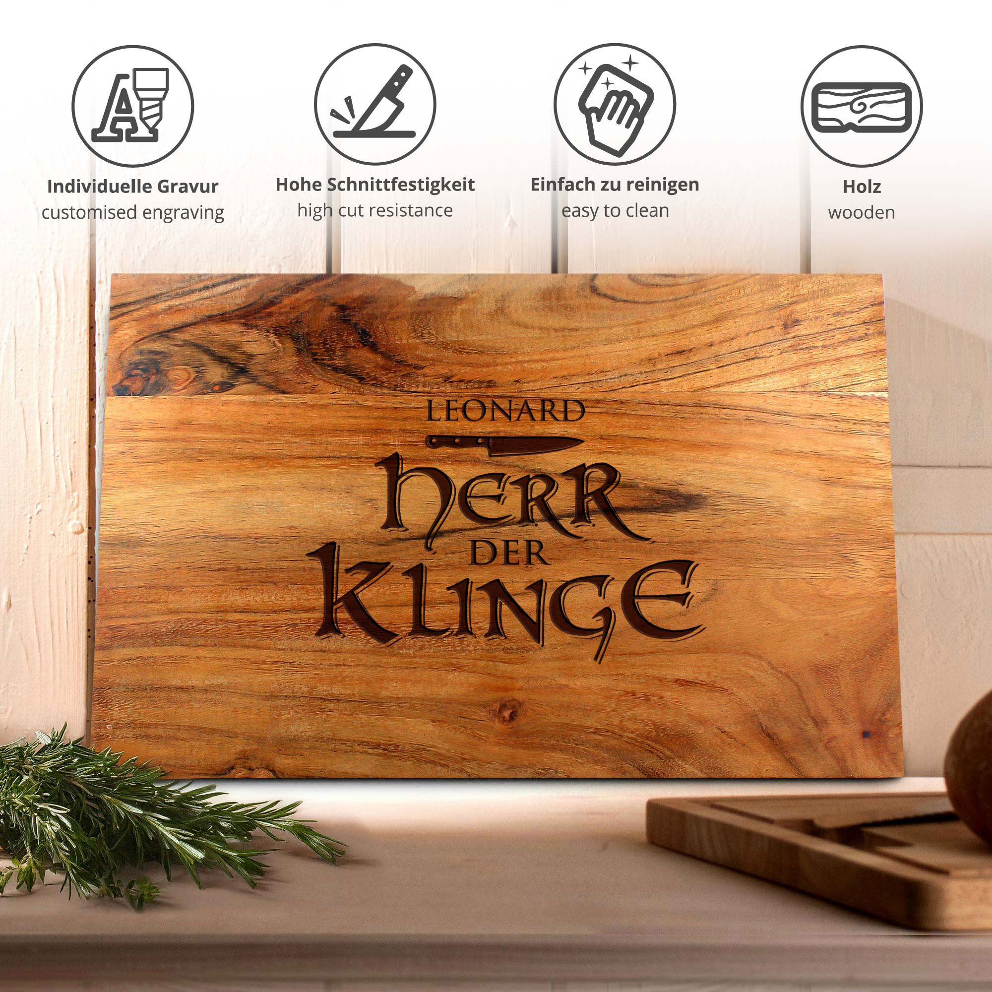 Dieses hochwertige Schneidebrett aus Akazienholz wird mit dem markanten Motiv "Herr der Klinge" und Ihrem Wunschnamen zu einem individuellen Statement in jeder Küche. Die präzise eingearbeitete Gravur verleiht dem massiven Holzbrett eine kraftvolle, charakterstarke Optik und macht es zu einem besonderen Geschenk für ambitionierte Hobbyköche und Küchenprofis. Durch die natürliche Maserung des Akazienholzes entsteht bei jedem Brett ein einzigartiges Unikat.