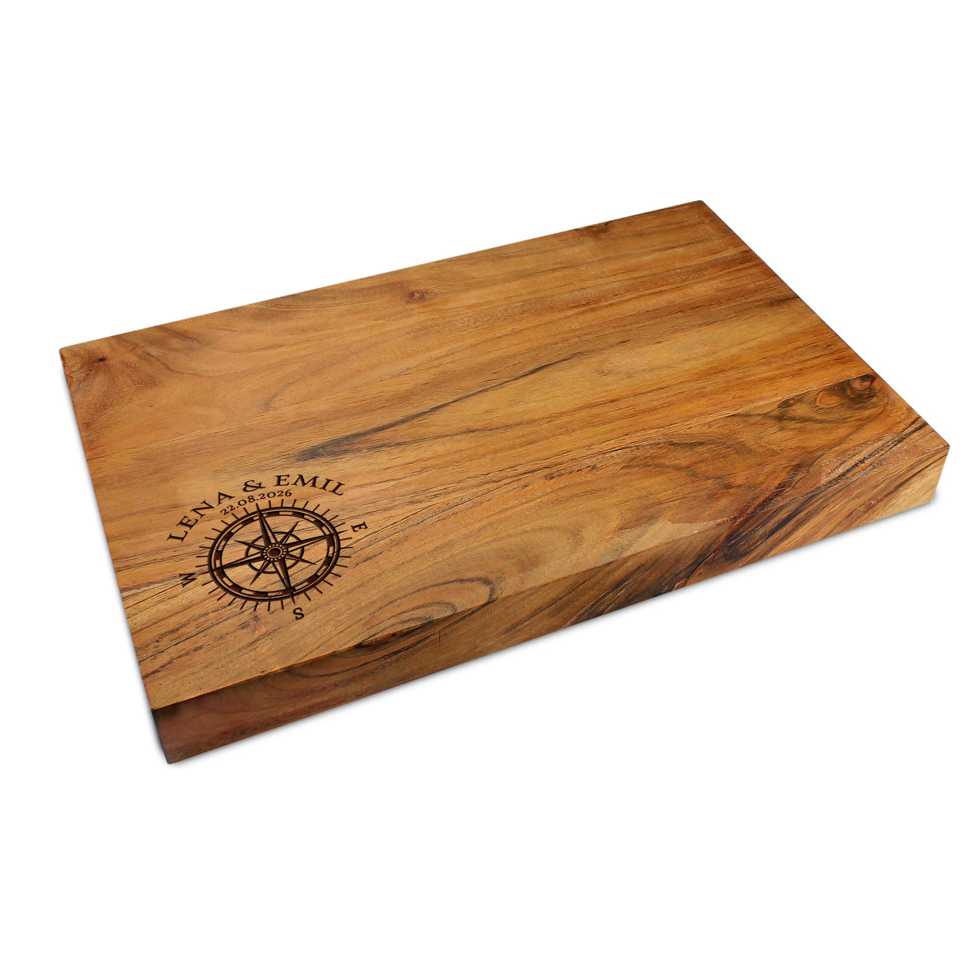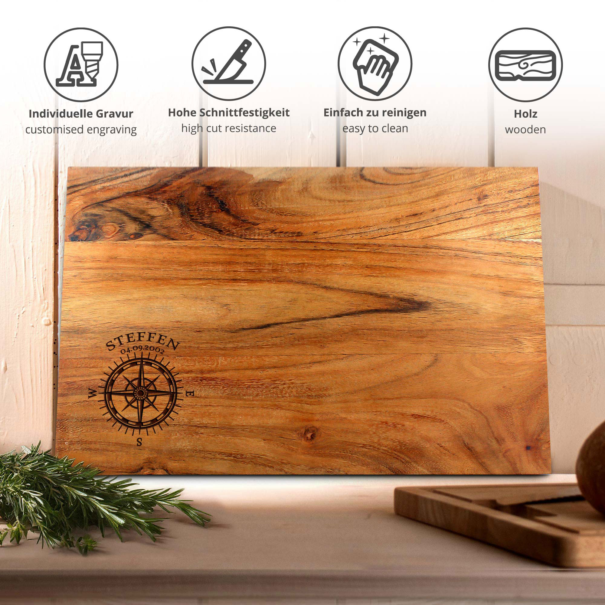 Dieses hochwertige Schneidebrett aus Akazienholz wird mit dem detailreichen Kompass-Motiv und Ihrem Wunschnamen zu einem individuellen Blickfang in jeder Küche. Die präzise Gravur verleiht dem massiven Holzbrett eine besondere Symbolkraft und steht für Orientierung, Beständigkeit und Stil. Durch die natürliche Maserung des Akazienholzes entsteht ein einzigartiges Gesamtbild.