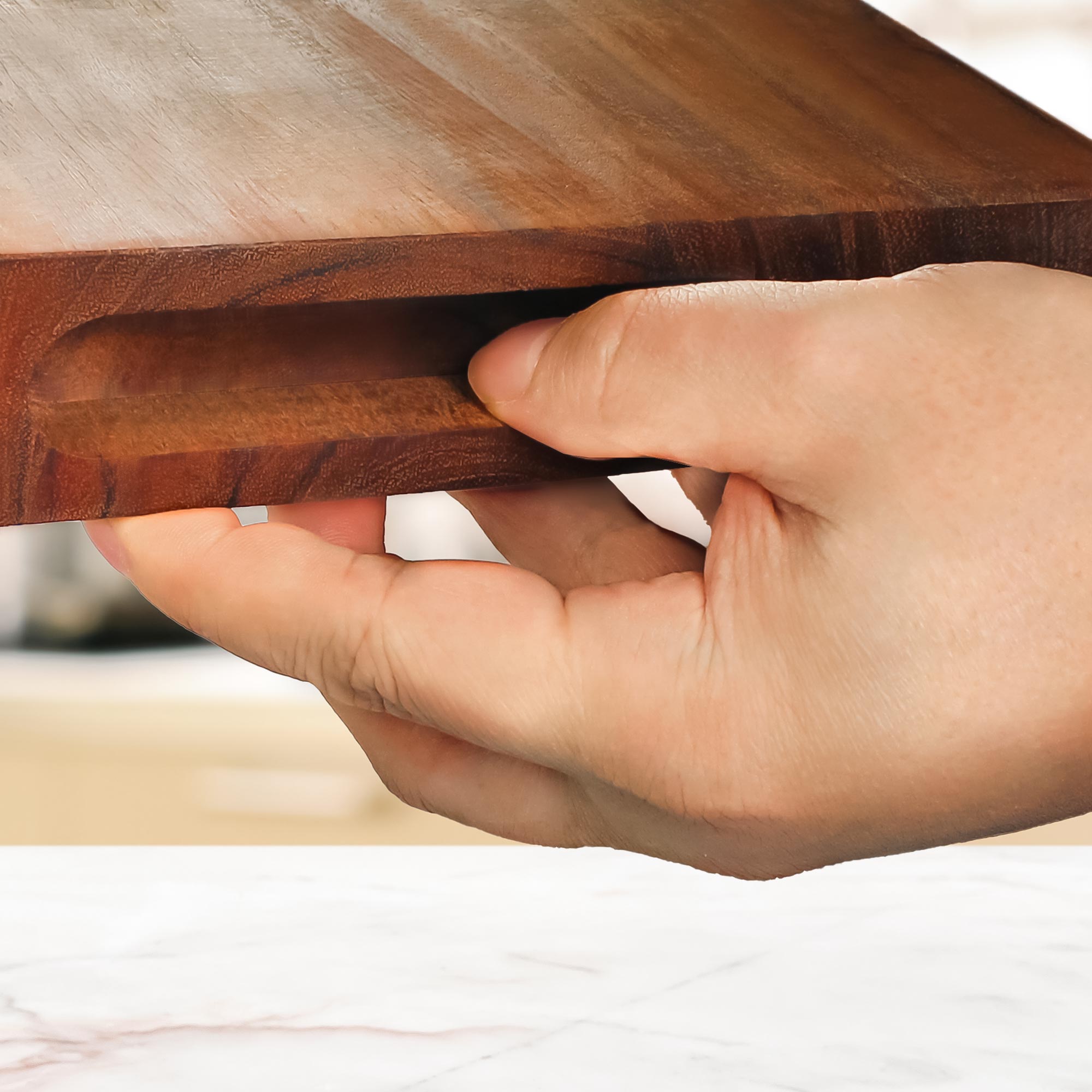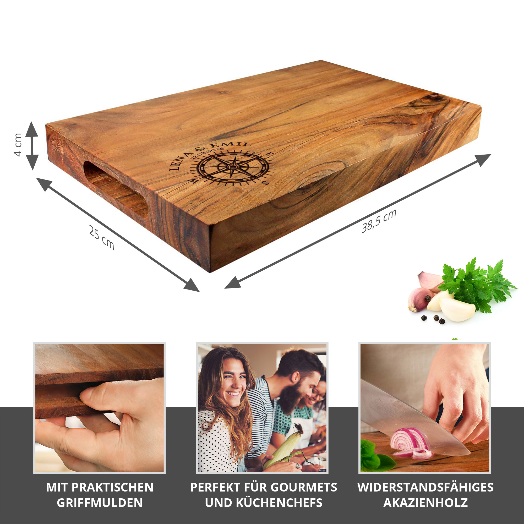 Mit 38,5 x 25 cm und einer massiven Stärke von 4 cm bietet das Schneidebrett eine stabile und langlebige Arbeitsfläche für den täglichen Gebrauch. Das nachhaltige, antibakterielle Akazienholz ist besonders schnittfest und widerstandsfähig. Die integrierte Griffmulde sorgt für einfaches Handling. Ob als Schneideunterlage oder als stilvolles Servierbrett – dieses personalisierte Holzbrett verbindet Funktionalität mit hochwertigem Design.