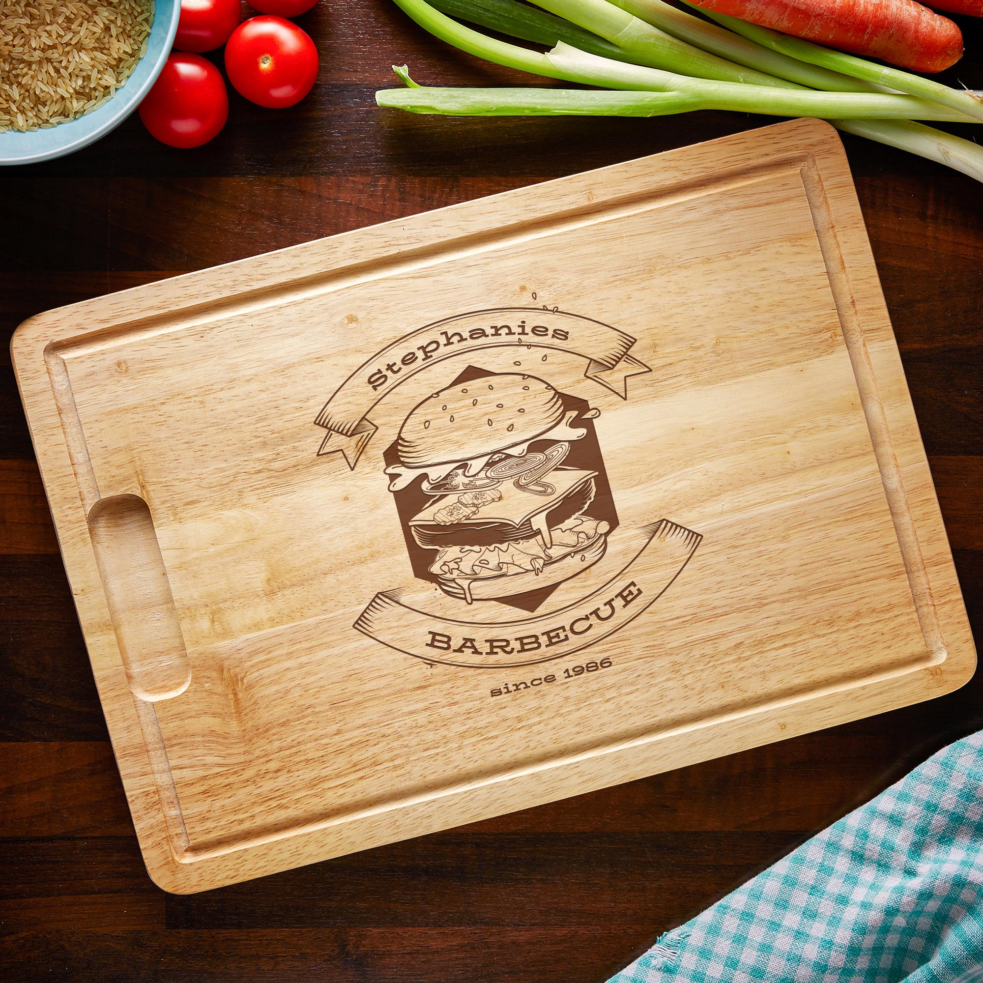 Hochwertiges Schneidebrett aus Holz mit persönlicher Gravur für echte Grillfans. Kreativ gestaltetes Kochbrett als tolles Geschenk für Burgerliebhaber und Hobbyköche! Die Grillsaison hat längst begonnen und ein passender Küchenhelfer muss her? Dann ist dieses sorgfältig verarbeitete und robuste Schneidebrett mit Burger Gravur und Personalisierung genau die richtige Anschaffung! Dieses schöne Holzbrett ist eine tolle Unterstützung beim Schnippeln und vorbereiten von allerlei Lebensmitteln. Das originelle Vesperbrett wird mit einem, wirklich lecker aussehenden, Burgersymbol sowie einem Wunschnamen und der Aufschrift Barbecue graviert. Zusätzlich fügen wir noch den Schriftzug Since und eine individuelle Jahreszahl hinzu. Ein ideales Präsent für alle, die gerne Kochen, Grillen und Zubereiten.