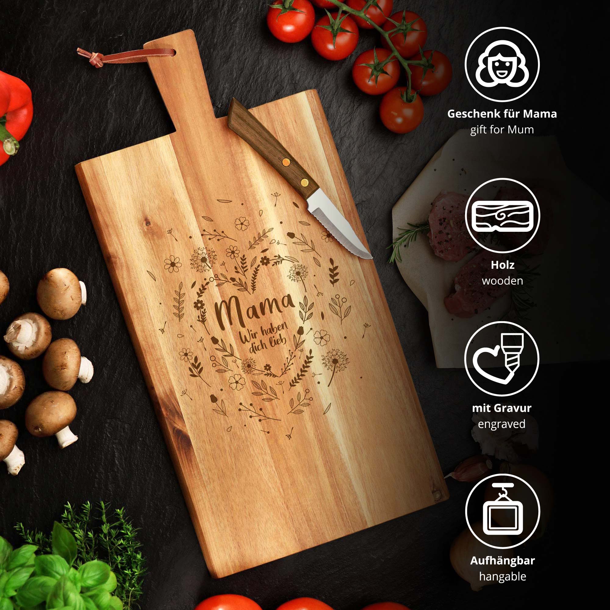 Das Messerschonende Brettchen ist dank des besonderen Blumenherzens das perfekte Muttertagsgeschenk. Auf dem schnittfesten Servierbrett tummeln sich eine Menge detaillierter Blüten in einem wundervollen Blumenherz, in dessen Mitte der Schriftzug "Mama, wir haben Dich lieb" verewigt ist. Zeige Deiner Mutter mit dem gravierten Brotzeitbrett Deine Dankbarkeit auf stilvolle Weise und würdige ihre alltägliche Hingabe!