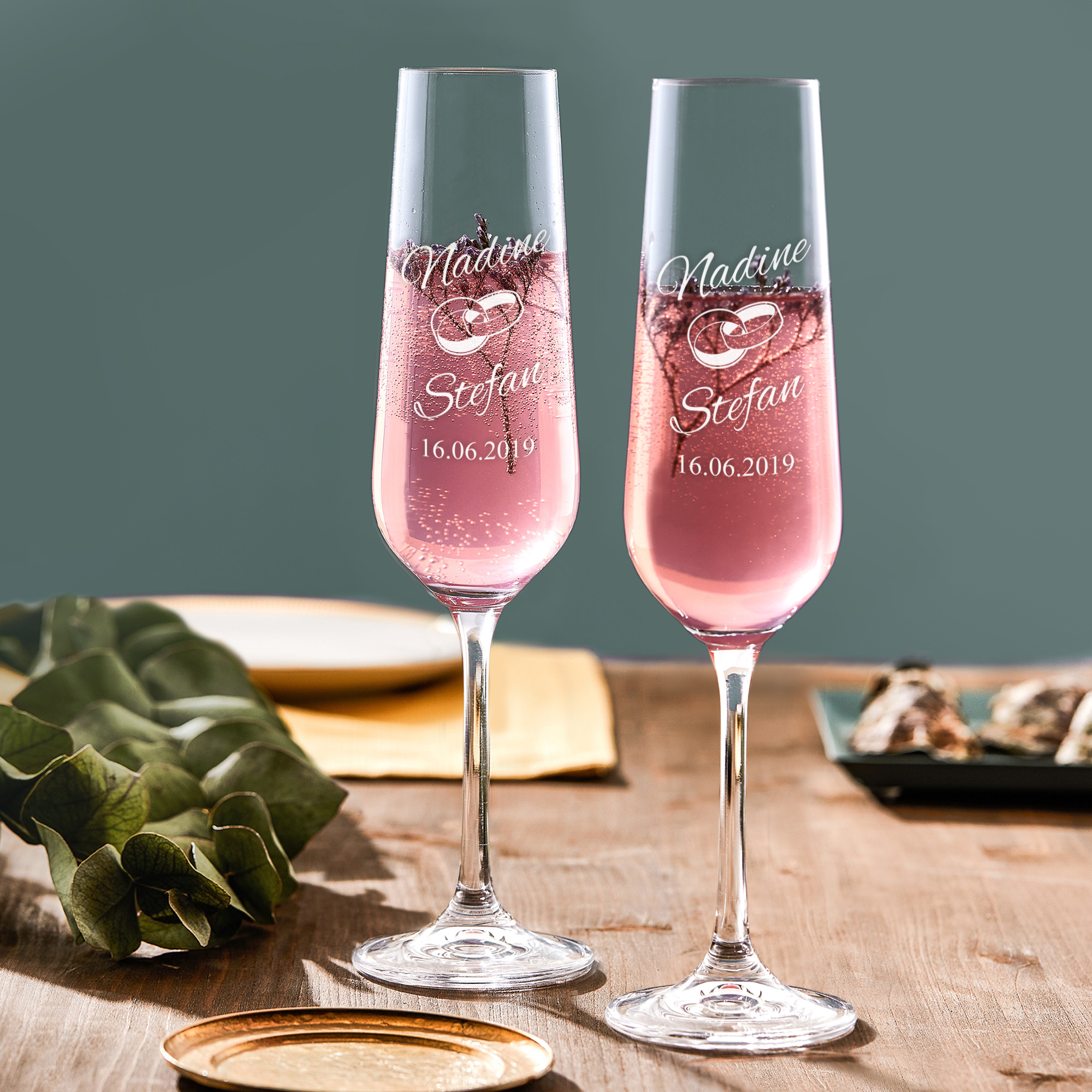 Eine Hochzeit ist Freudenfest - und wie feiert man am Besten? Mit Sekt natürlich. Am besten aus individuellen Gläsern.