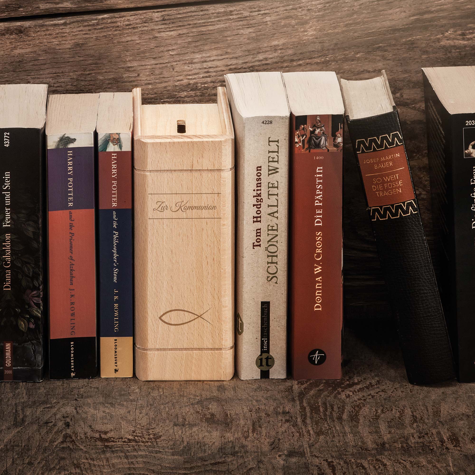 Die Kommunion ist nicht nur der Übergang vom Kind zum Erwachsenen - sie ist auch die Aufnahme in eine Gemeinschaft. Ein schönes Geschenk dafür: Spardose Buch aus Holz mit Gravur zur Kommunion - Personalisiert.