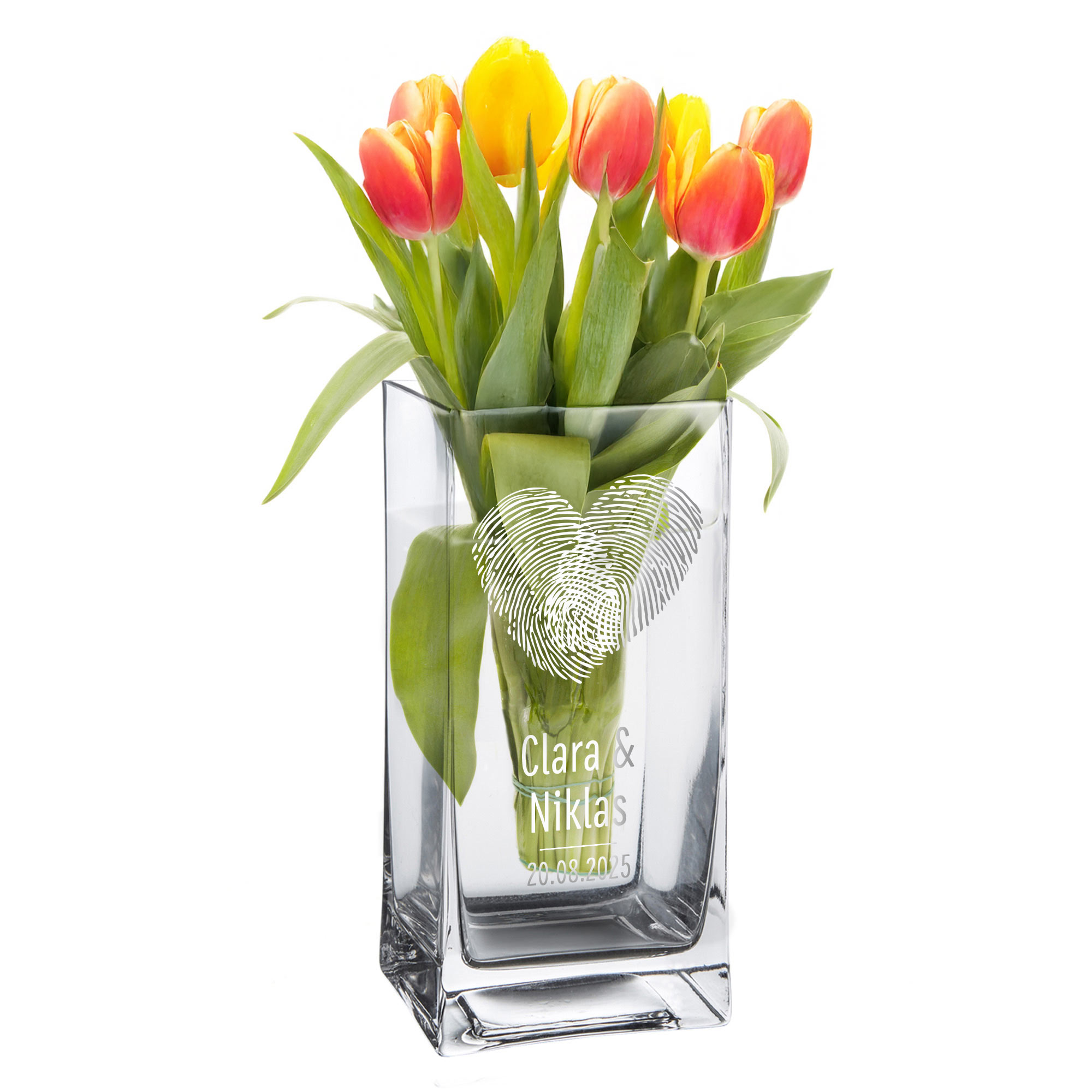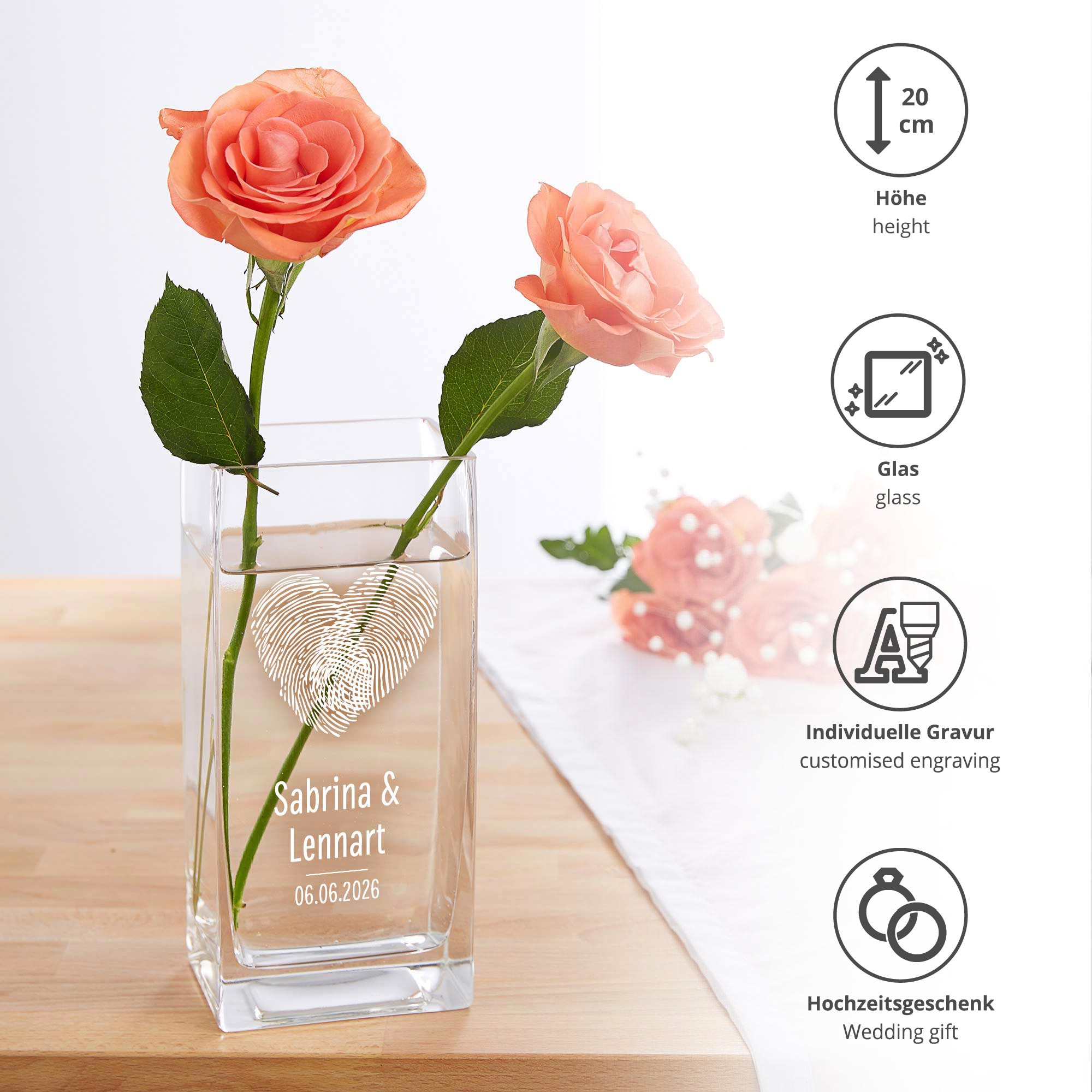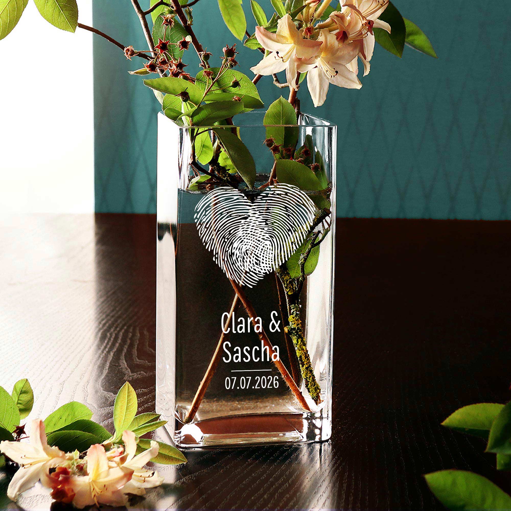 Diese elegante Glasvase wird durch das kunstvoll gravierte Fingerabdruck-Herz zu einem ganz persönlichen Geschenk. Ob zur Hochzeit, zum Valentinstag oder zum Jahrestag – die individuelle Gravur mit zwei Namen und einem Wunschdatum macht diese runde Vase zu einem bedeutungsvollen Erinnerungsstück an gemeinsame Momente.