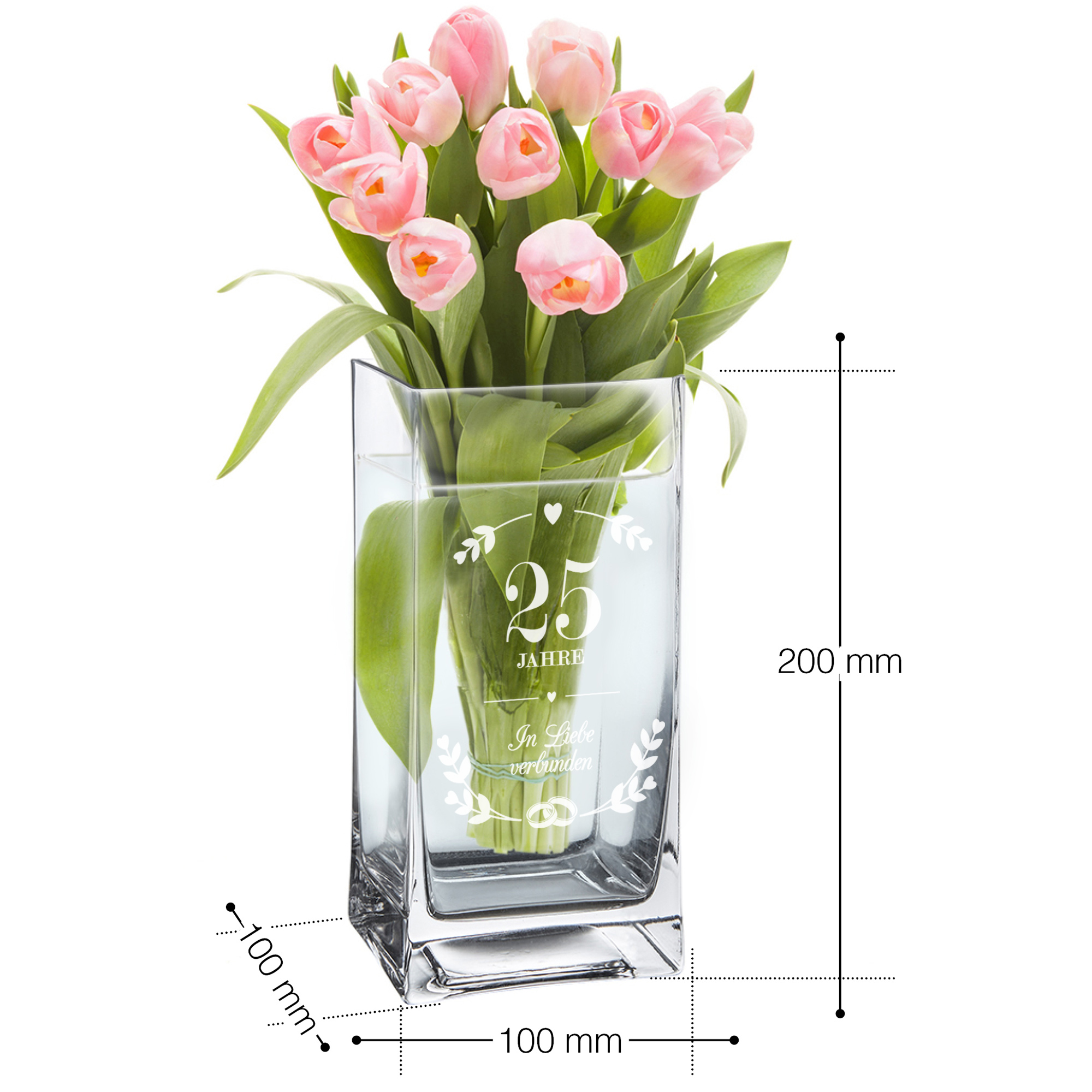 25 Jahre Ehe sind eine ziemlich lange Zeit in liebevoller Zweisamkeit. Zeige mit der Vase mit Gravur Deine Wertschätzung und verschenke ein einzigartiges Blumengeschenk zu diesem ganz besonderen Hochzeitstag. Die eckige Blumenvase bietet ausreichend Platz für einen Blumenstrauß in angemessener Größe als Geschenk zur Silberhochzeit und ist mit dem passenden Schriftzug "25 Jahre in Liebe verbunden" graviert.