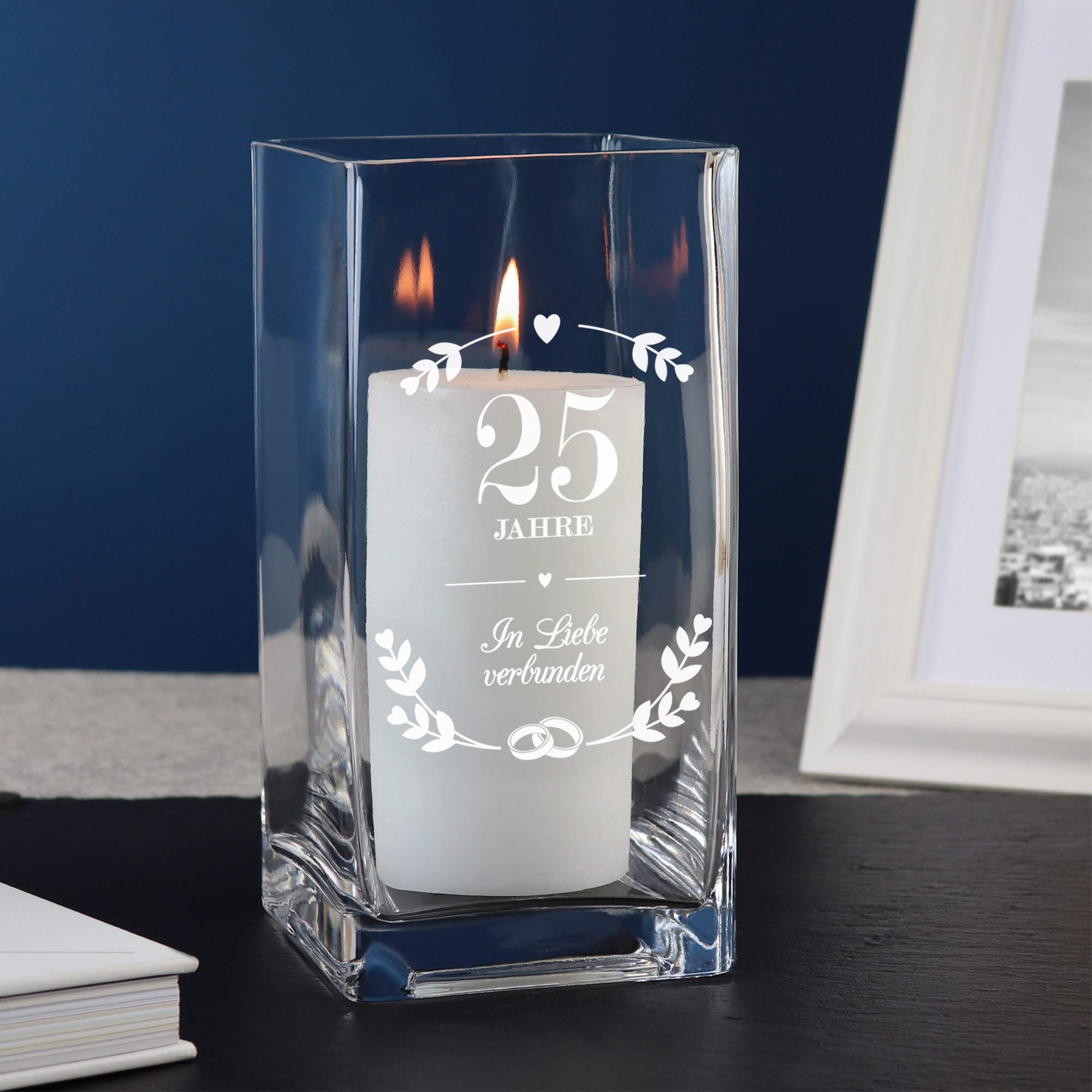 Die Gravur wird von romantischen Zweigen sowie einem stilvollen Ringmotiv umgeben und ist ein hervorragendes Geschenk zur silbernen Hochzeit für ein stets glückliches Paar. Überreiche die Deko Vase an ein befreundetes Pärchen oder auch Deine Eltern zum runden Liebes-Jubiläum und wecke die emotionalen Erinnerungen an die Traumhochzeit vor einem Vierteljahrhundert.