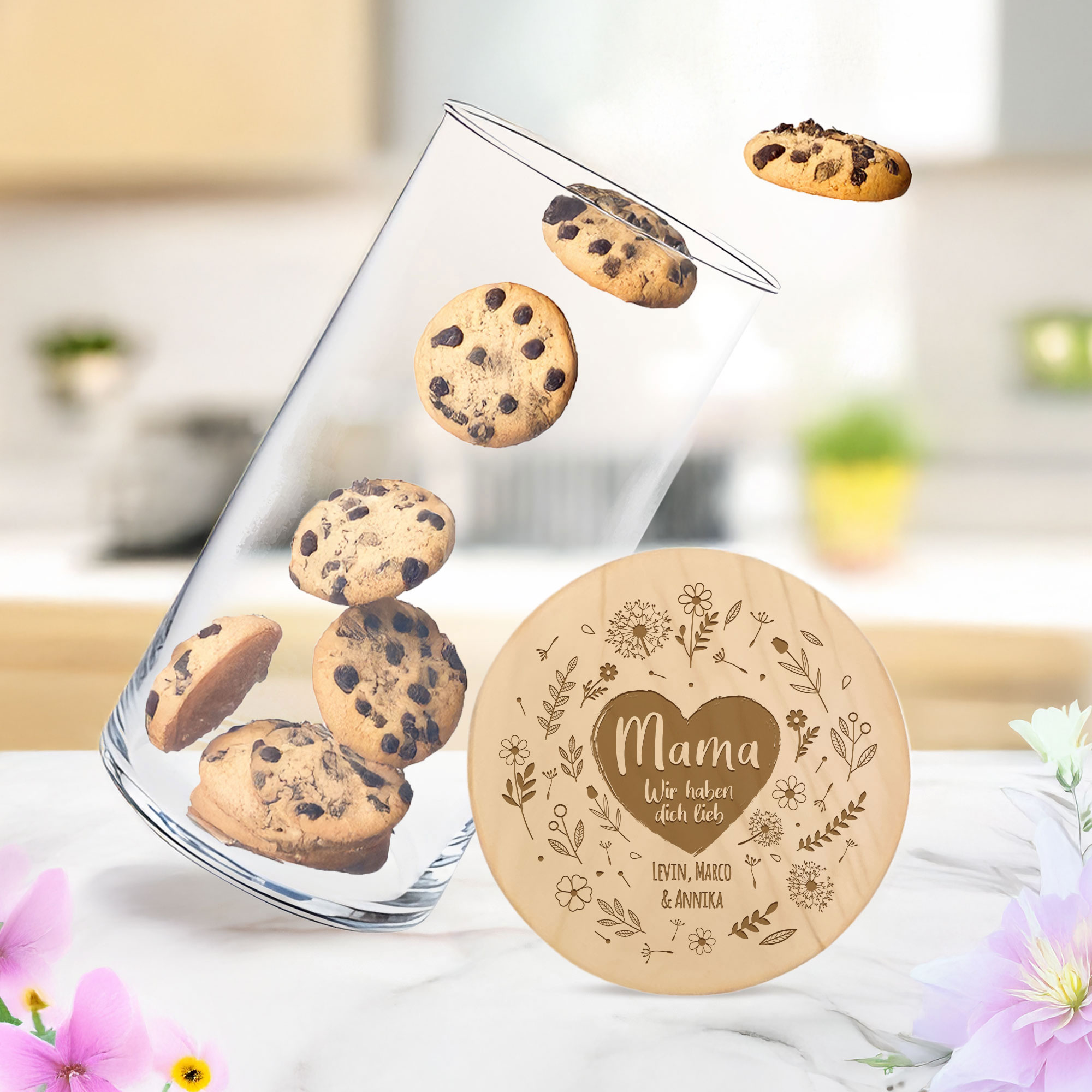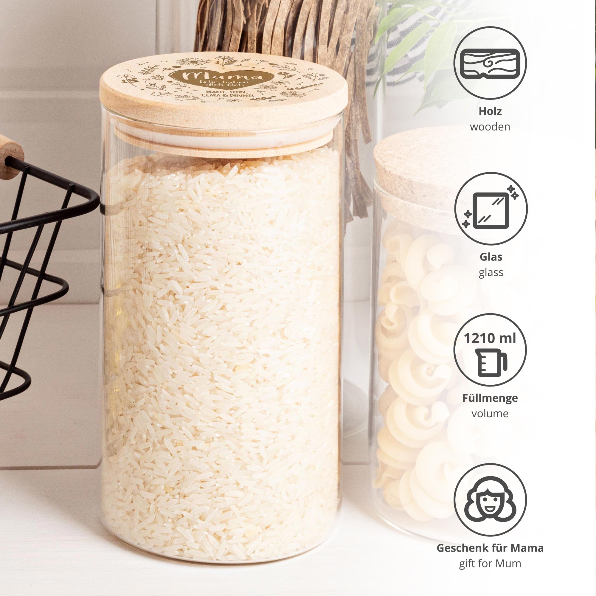 Dieses personalisierte Vorratsglas mit liebevollem Blumenherz-Motiv ist eine stilvolle und zugleich praktische Geschenkidee für Mama. Der hochwertige Glasbehälter wird durch einen passgenauen Holzdeckel ergänzt, der mit dem ausgewählten Motiv und den gewünschten Namen veredelt wird. So entsteht ein individuelles Küchenaccessoire, das Funktionalität und emotionale Bedeutung harmonisch verbindet.