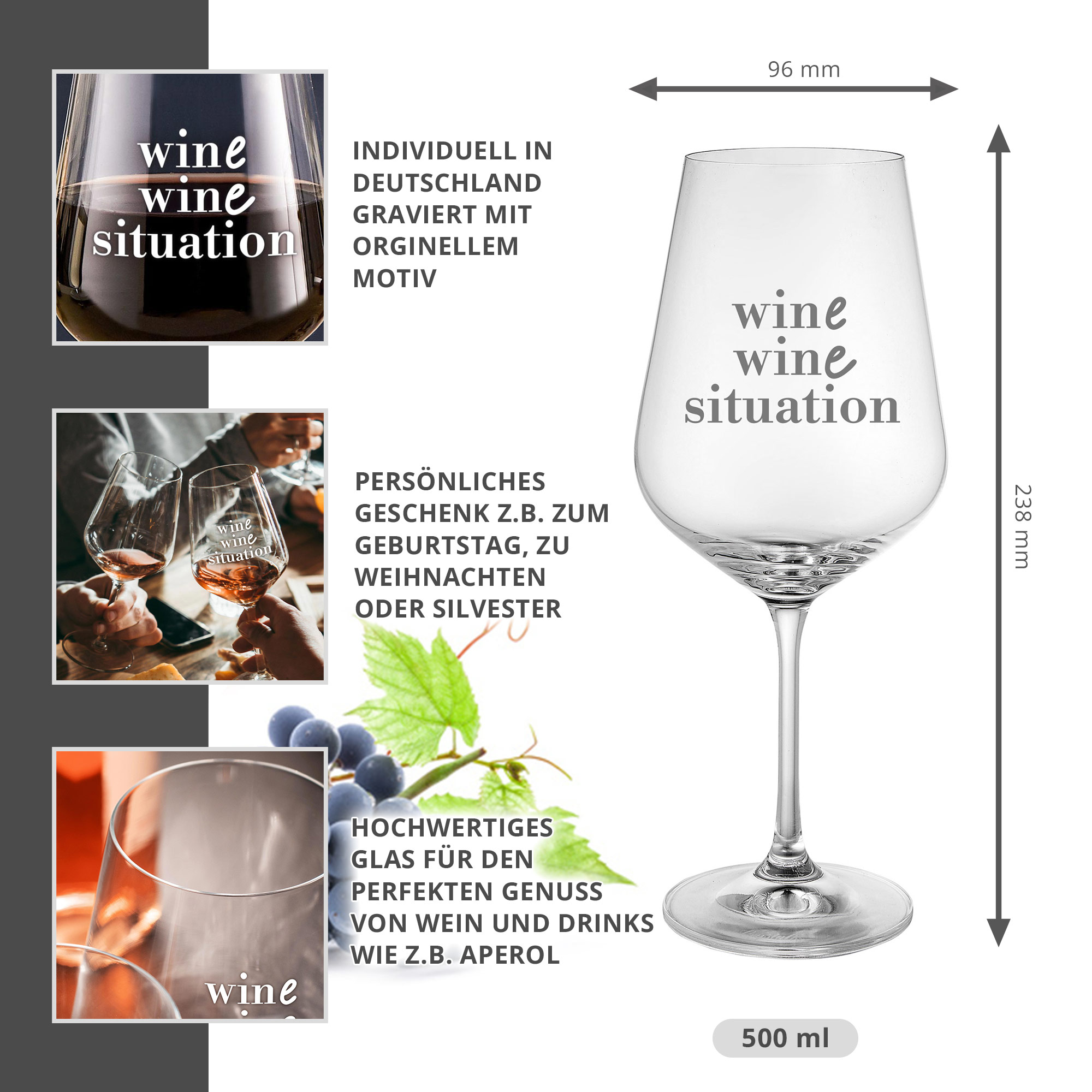 Das bezaubernde Weinglas mit der verspielten Gravur "Wine Wine Situation" macht den Weingenuss zu einem vergnüglichen Abenteuer. Die kunstvolle Schriftzuggravur verleiht dem Glas eine einzigartige Persönlichkeit und setzt einen humorvollen Akzent, der jeden Schluck zu einem amüsanten Erlebnis macht.Egal, ob bei geselligen Zusammenkünften oder entspannten Abenden allein, dieses Weinglas verbindet den Genuss exquisiten Weins mit einer Prise Leichtigkeit und Humor, und wird so zum perfekten Begleiter für Weinliebhaber mit Sinn für das Besondere. Überreiche das Weinglas als außergewöhnliches Wein-Geschenk und sorge für eine gelungene Überraschung!