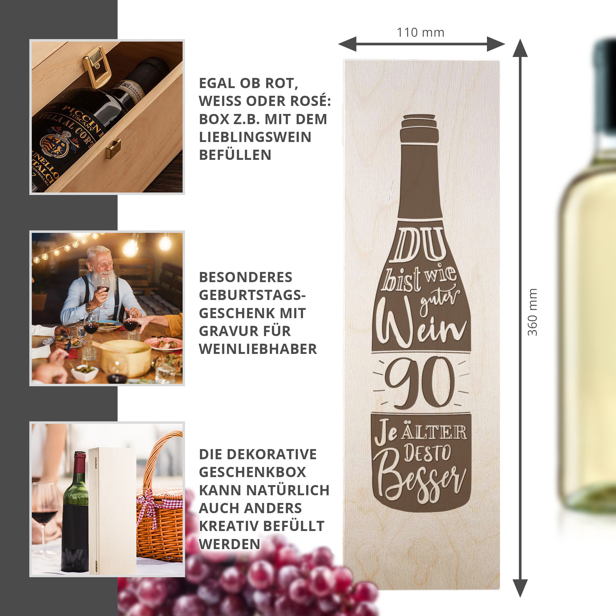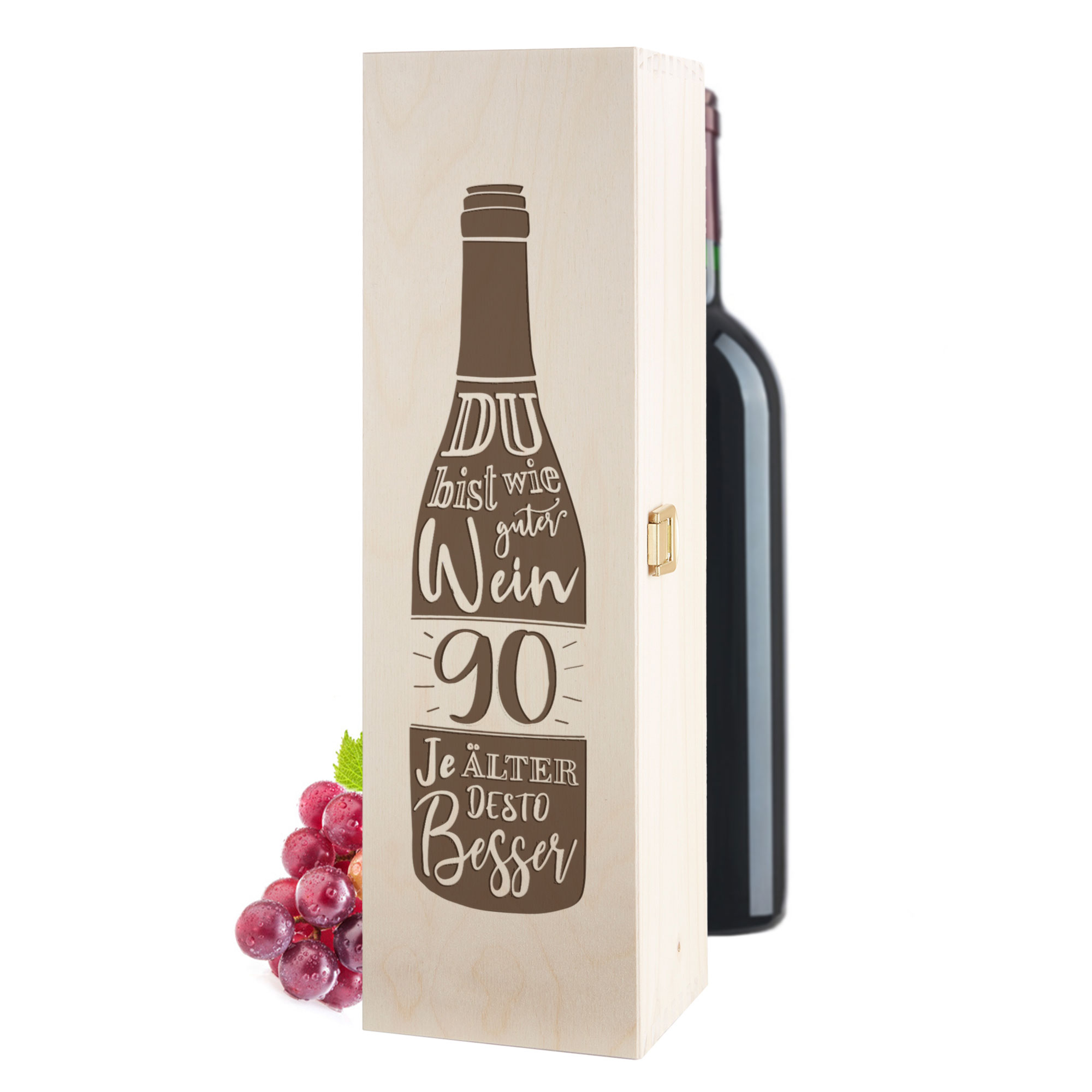 Das exklusive Weingeschenk zum 90. Jubiläum! Mit der Weinkiste zum 90. Ehrentag überreichst Du ein einzigartiges Geschenk zu einem besonderen Anlass. Gestalte mit einer Flasche Wein und anderen Kleinigkeiten wie Botschaften oder Gutscheinen eine persönliche Geschenkkiste für das Geburtstagskind!