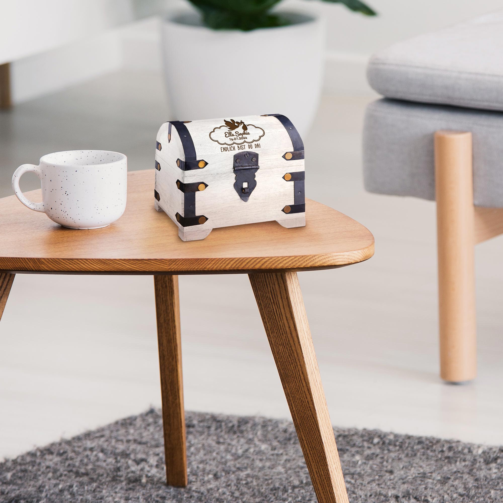 Unsere weiße Holz-Schatztruhe mit Gravur zur Geburt ist nicht nur ein Geschenk, sondern ein Symbol der Freude und des Glücks, das die Ankunft eines neuen Familienmitglieds verkündet. Mit einem liebevoll gestalteten Storch-Motiv auf der Oberfläche strahlt sie Eleganz und Tradition aus, während die individuelle Gravur mit dem Namen des Neugeborenen und dem Geburtsdatum eine persönliche Note verleiht. Diese Schatztruhe bietet eine stilvolle Möglichkeit, Geldgeschenke für Jungen und Mädchen zu präsentieren, während sie gleichzeitig als zeitloses Erinnerungsstück fungiert, das den Beginn eines neuen Lebensabschnitts gebührend feiert.