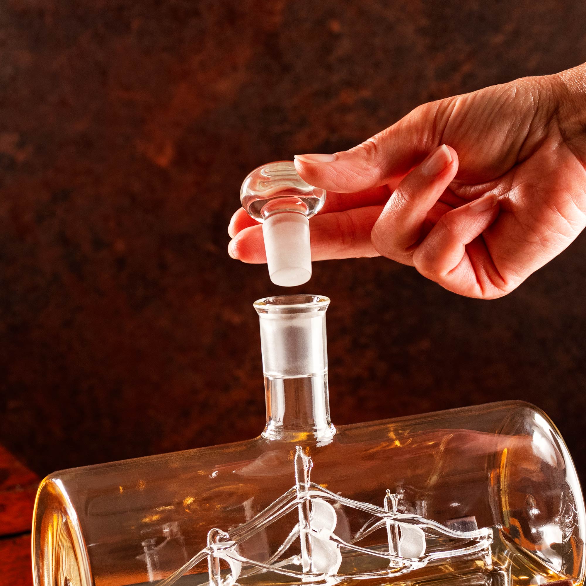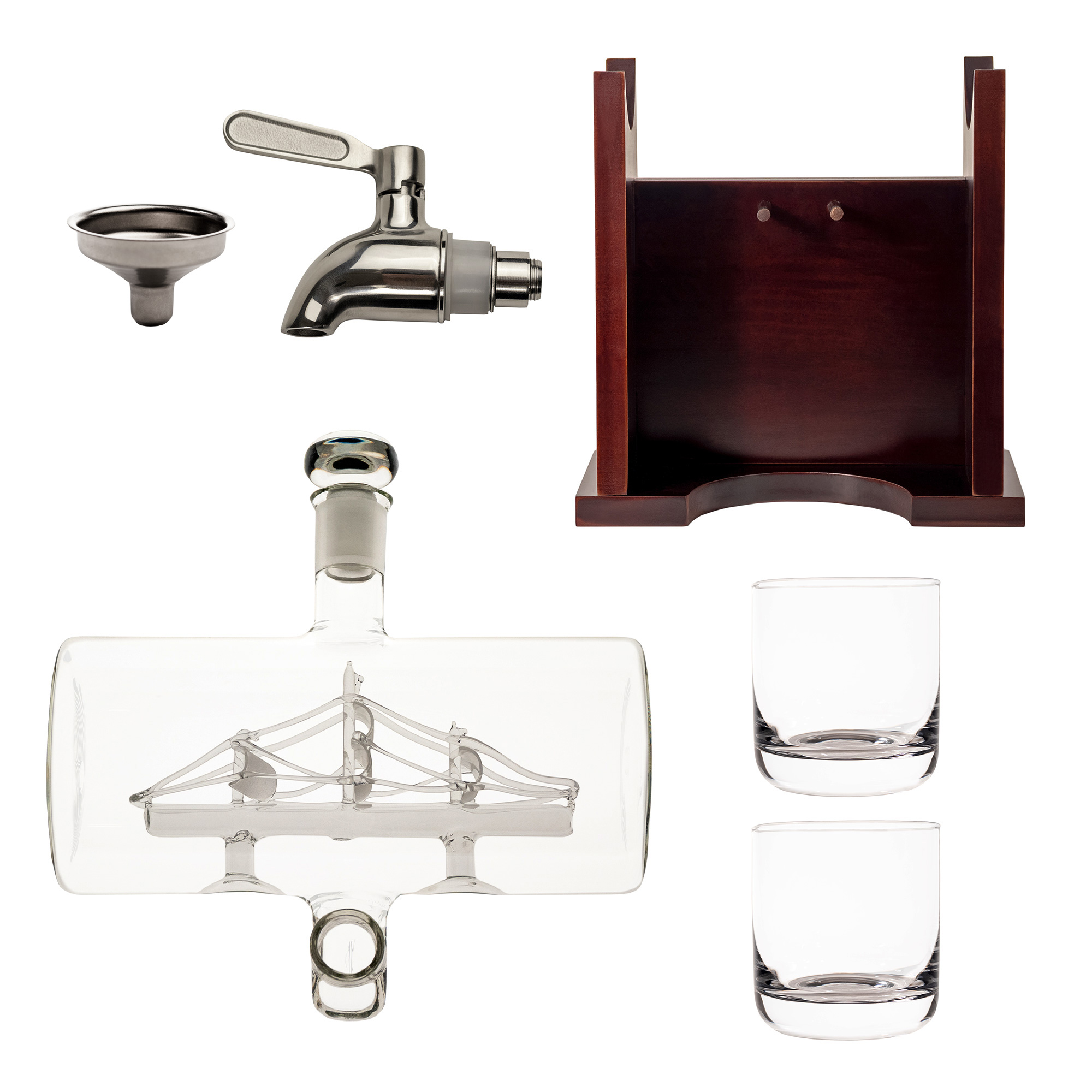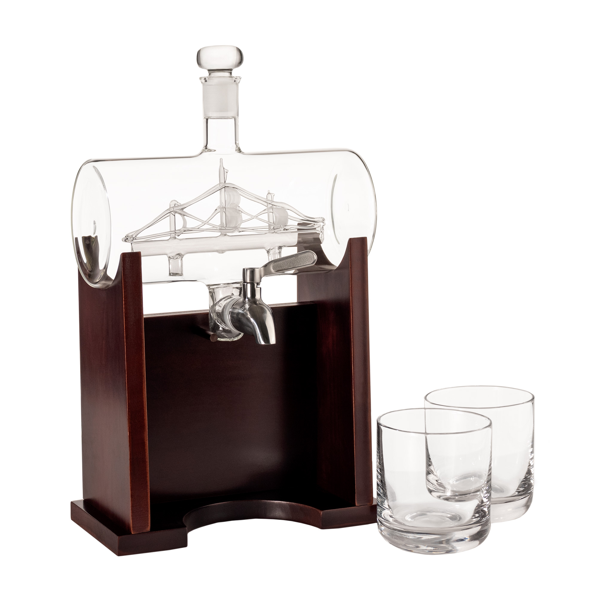 - Barrel Dekanter aus Klarglas mit dekorativem Segelschiff im Inneren