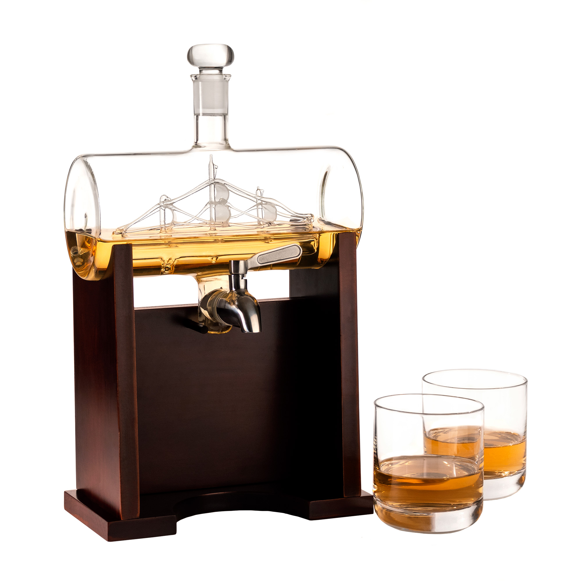 Dieses hochwertige Whisky Set überzeugt durch seine außergewöhnliche Fass-Optik und wird zum stilvollen Blickfang in jeder Hausbar. Die elegante Karaffe in Barrel-Form besteht aus klarem Glas und beherbergt ein detailreiches Segelschiff im Inneren, das dem Dekanter eine besondere Tiefe und maritime Eleganz verleiht. Präsentiert wird die Karaffe auf einem stabilen Echtholz-Ständer, der das edle Gesamtbild harmonisch abrundet.