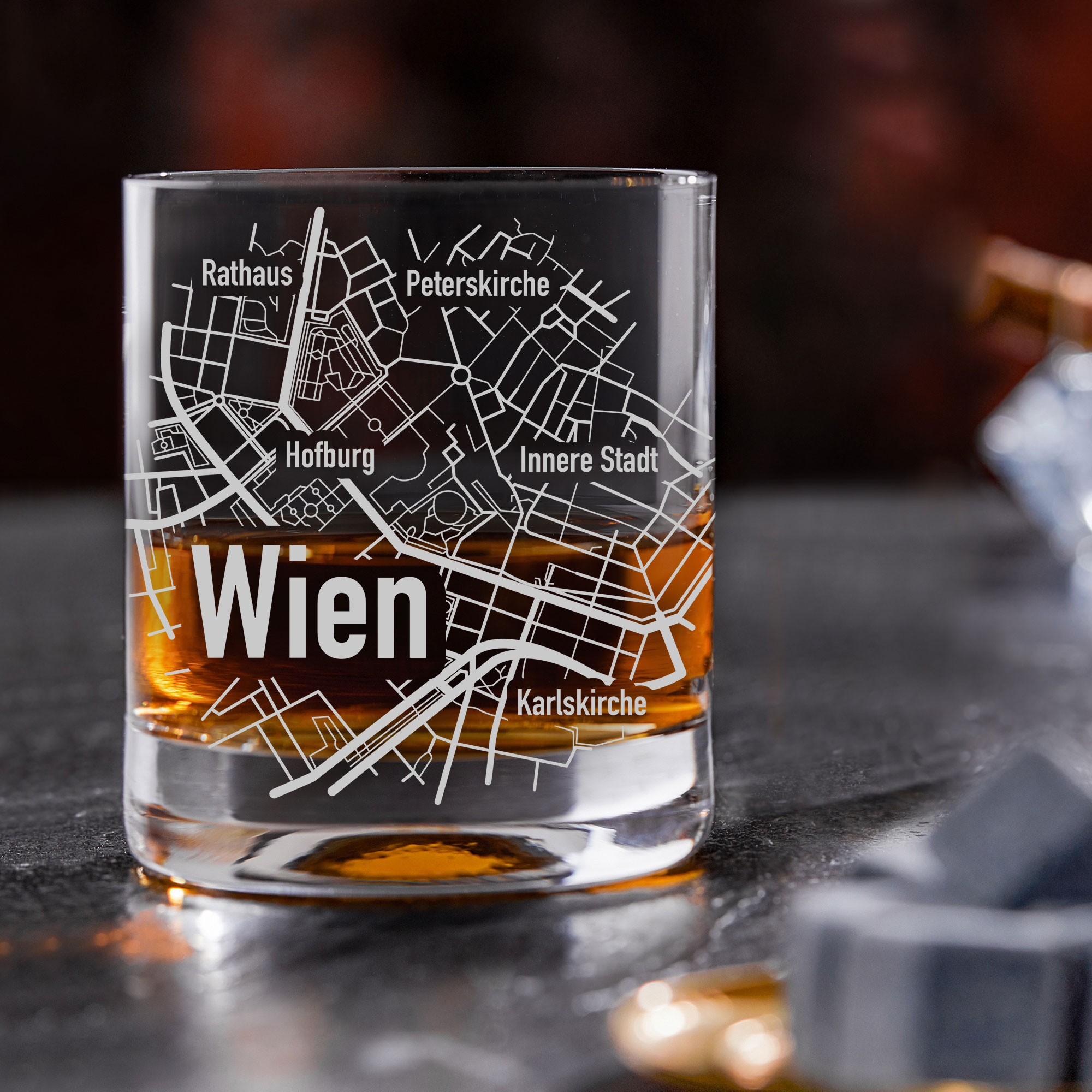 Wien ist bekannt für seine zahlreichen Sehenswürdigkeiten wie die Hofburg oder die Peterskirche. Entdecke mit dem Whiskyglas alle Highlights der österreichischen Hauptstadt während Deiner persönlichen Whisky Auszeit. Auf dem außergewöhnlichen Wien Glas werden die Hauptverkehrsachsen und bekannte Orte der Großstadt verewigt, wodurch ein wahres Schmuckstück entsteht.