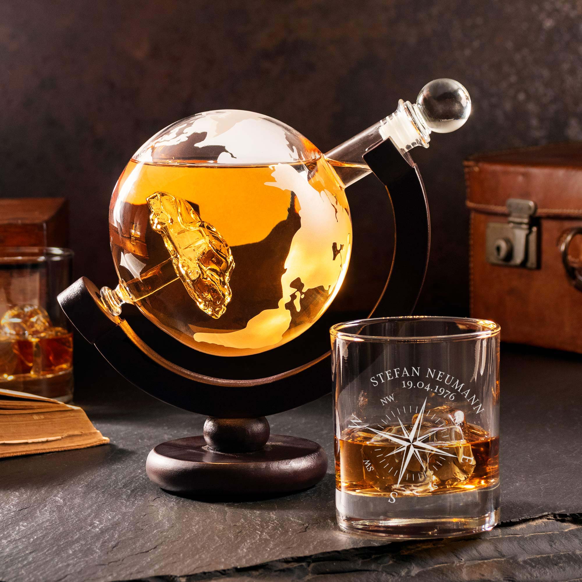 Whiskyset Karaffe Globus mit Auto und Whiskyglas mit Gravur - Kompass